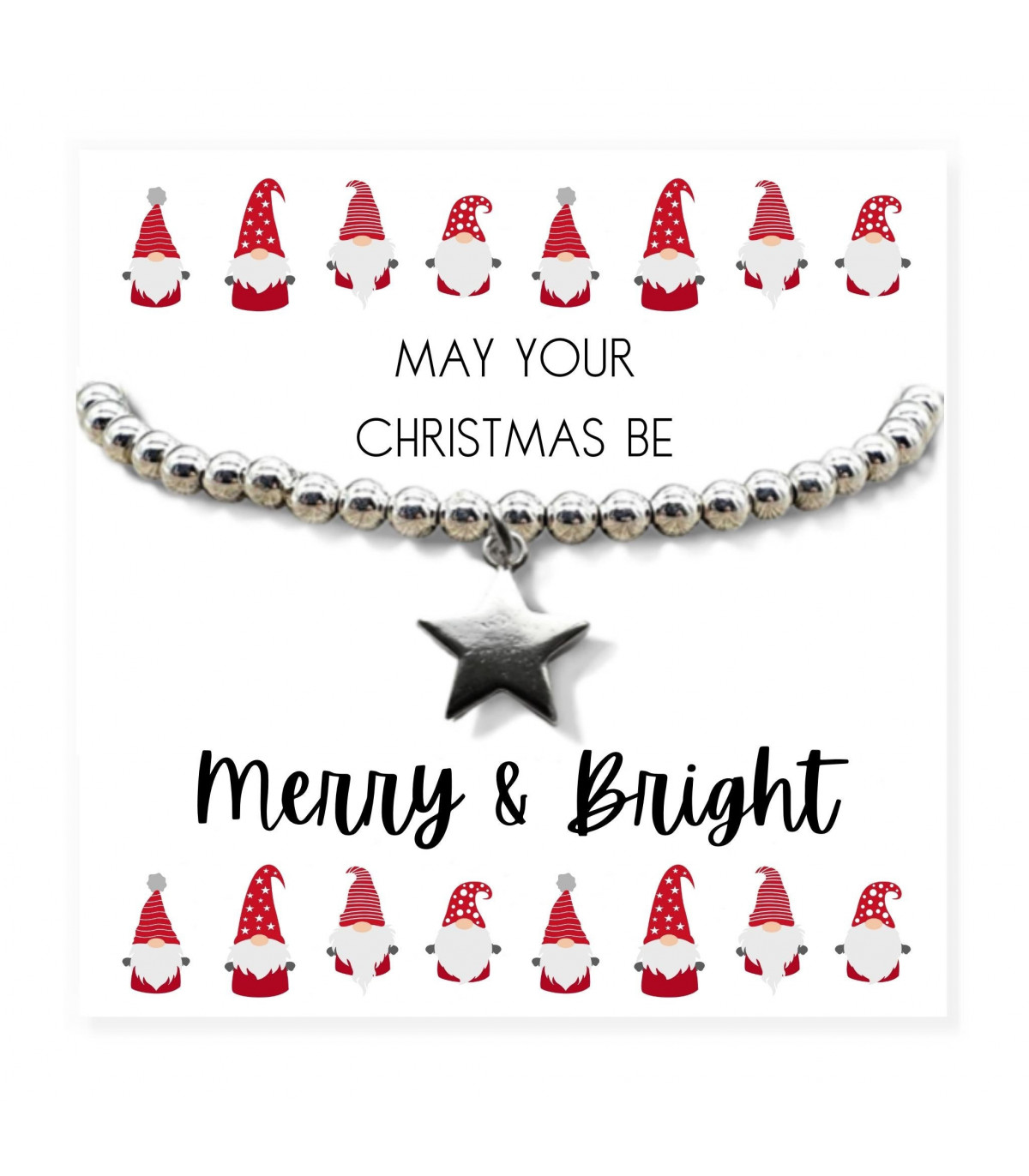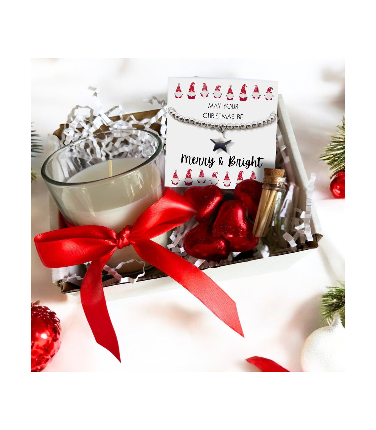 This festive Christmas gift hamper includes a star silver plated beaded bracelet, presented on a message card with the phrase "May Your Christmas Be Merry and Bright" with cute Christmas gnomes. Additionally, the set comes with a beautiful linen scented candle with matches and four delicious milk chocolate hearts filled with creamy caramel centre. Perfect for mothers, sisters, daughters, aunts, or grandmothers, this delightful gift offers a small section for a personal note or the choice to keep it blank.