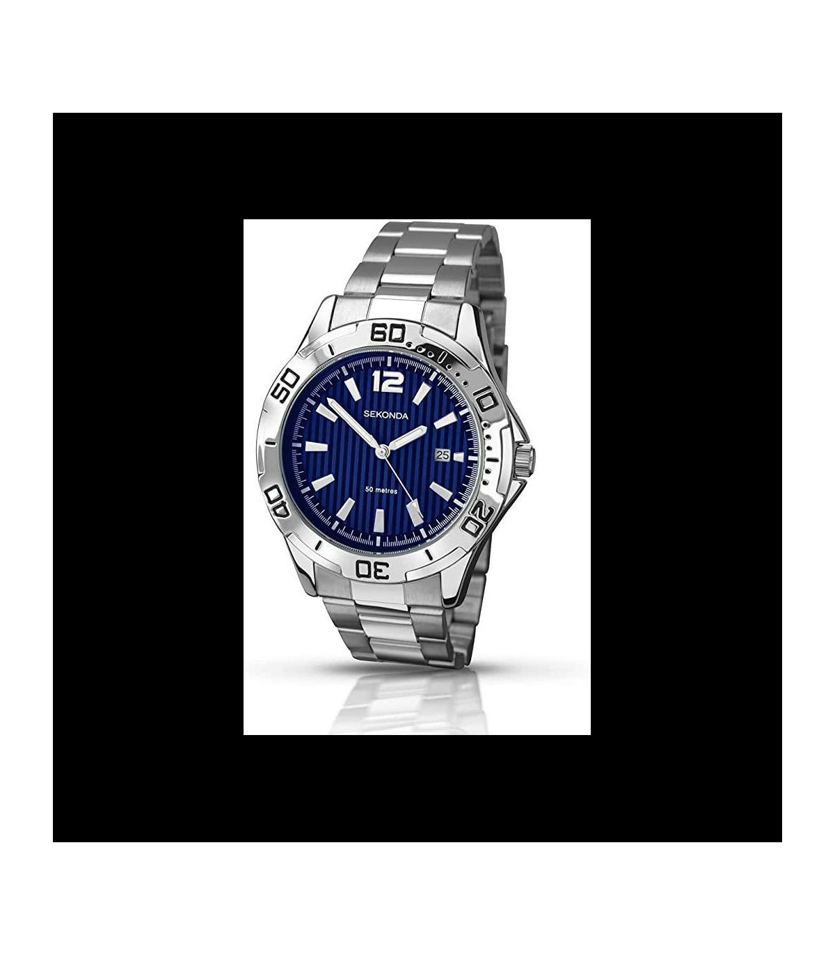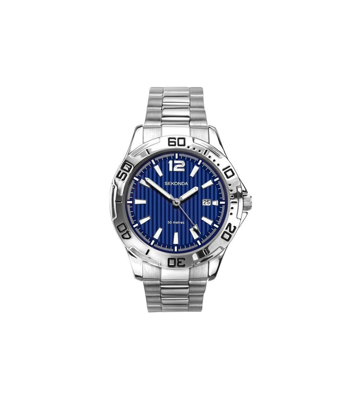 Sekonda 1170 Polished finish, black etched bezel takes the eye to the blue stripe dial with luminous 12, hour bars, hour, minute and second hands, plus date function, with matching 1.8cm matt and polished finish adjustable bracelet with fold over clasp. Water resistant 50m. Brand Name: Sekonda Model number: 1170 Item Shape: Round Dial Window Material Type: Mineral Crystal Glass Display Type: Analog Clasp Type: Deployment Clasp Case Material: Metal Alloy Case Diameter: 41 millimetres Case Thickness: 8 millimetres Band Material: Stainless Steel Band Width: 18 millimetres Band Colour: Silver Dial Colour: Blue Special Features: Calendar Movement: Quartz Water Pressure Resistance: 5.00 bar Warranty Type: Manufacturer