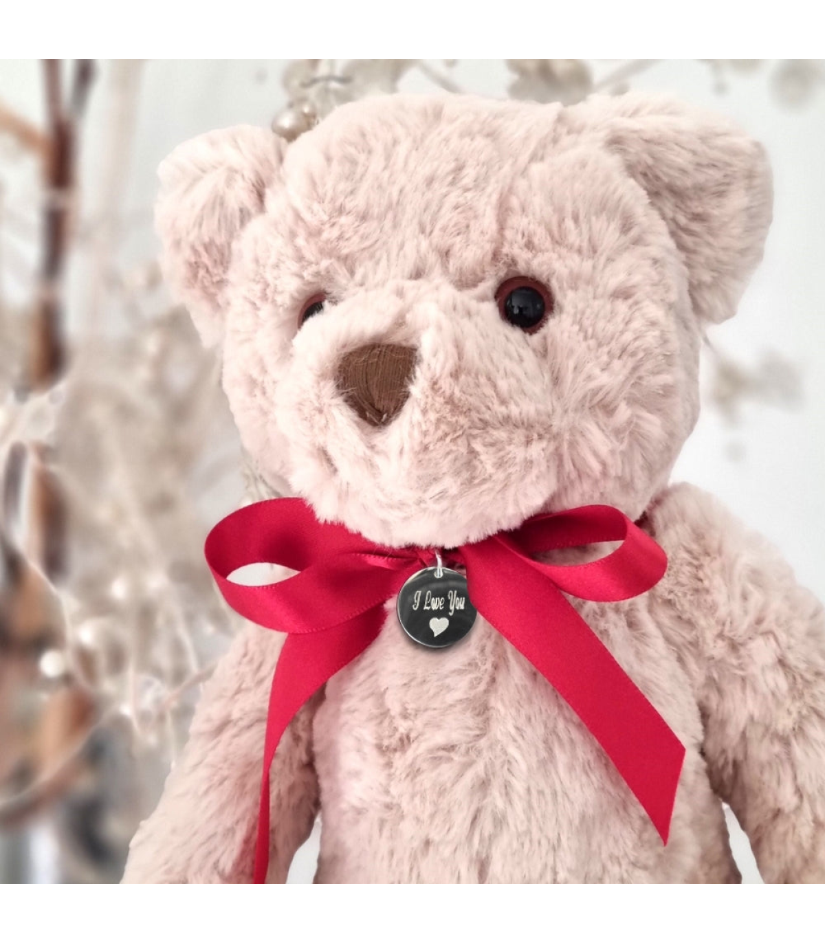 Our luxurious teddy bear is a wonderful gift for your loved one on Valentines Day, this is a special keepsake gift to treasure forever. The stainless steel disc engraved with "I love You" with a heart symbol that is placed on a red satin ribbon.