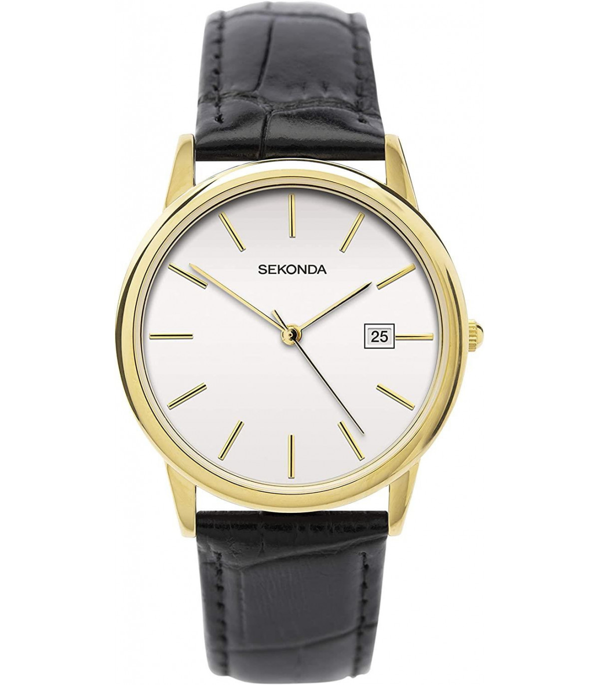Sekonda Men's white dial with gold battons, dated, black leather strap watch 1718