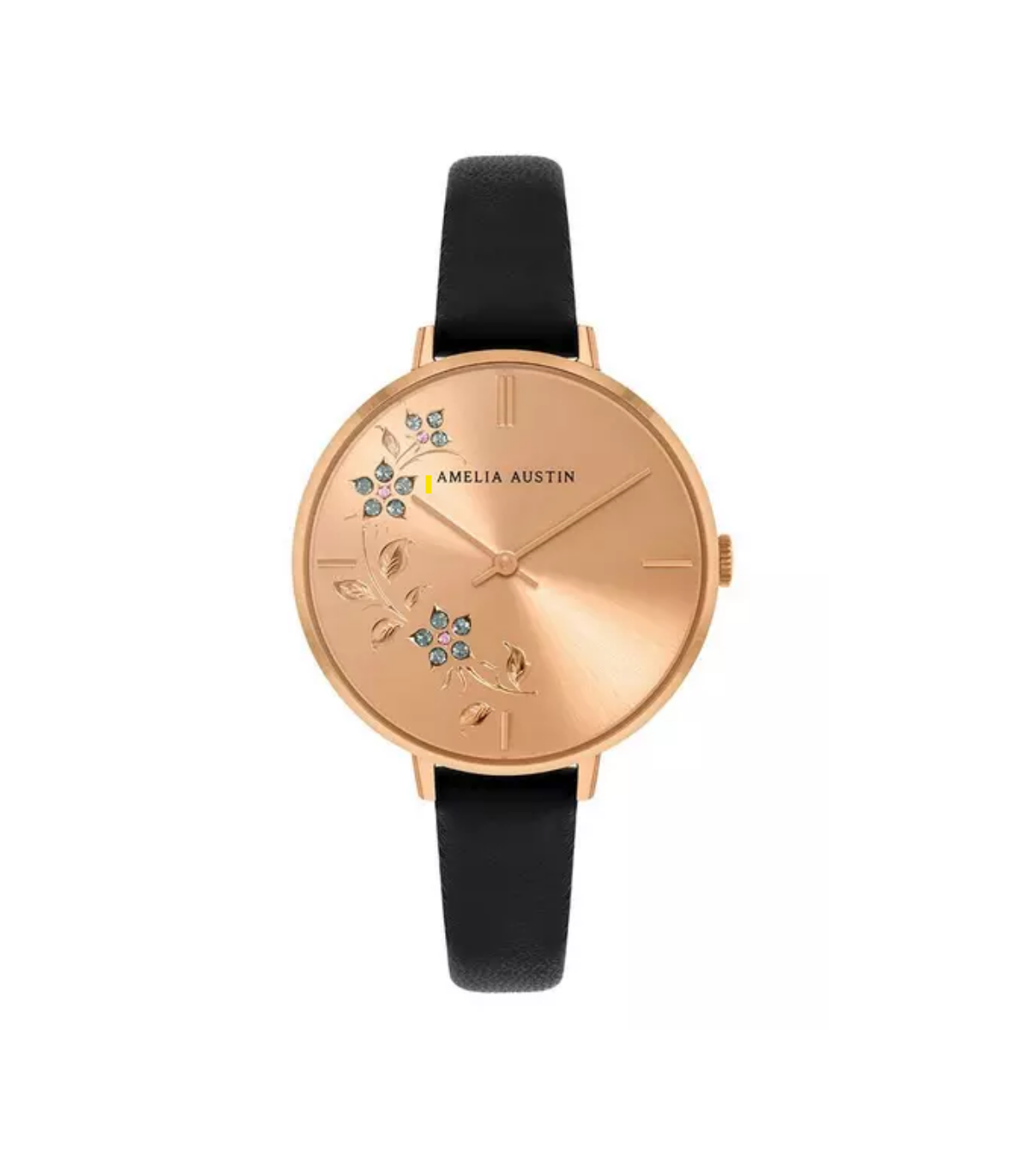 Amelia Austin Ladies Floral Black Leather Strap Clear Stone Set Etched Dial Watch AA2002