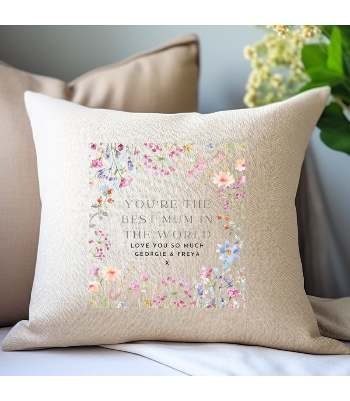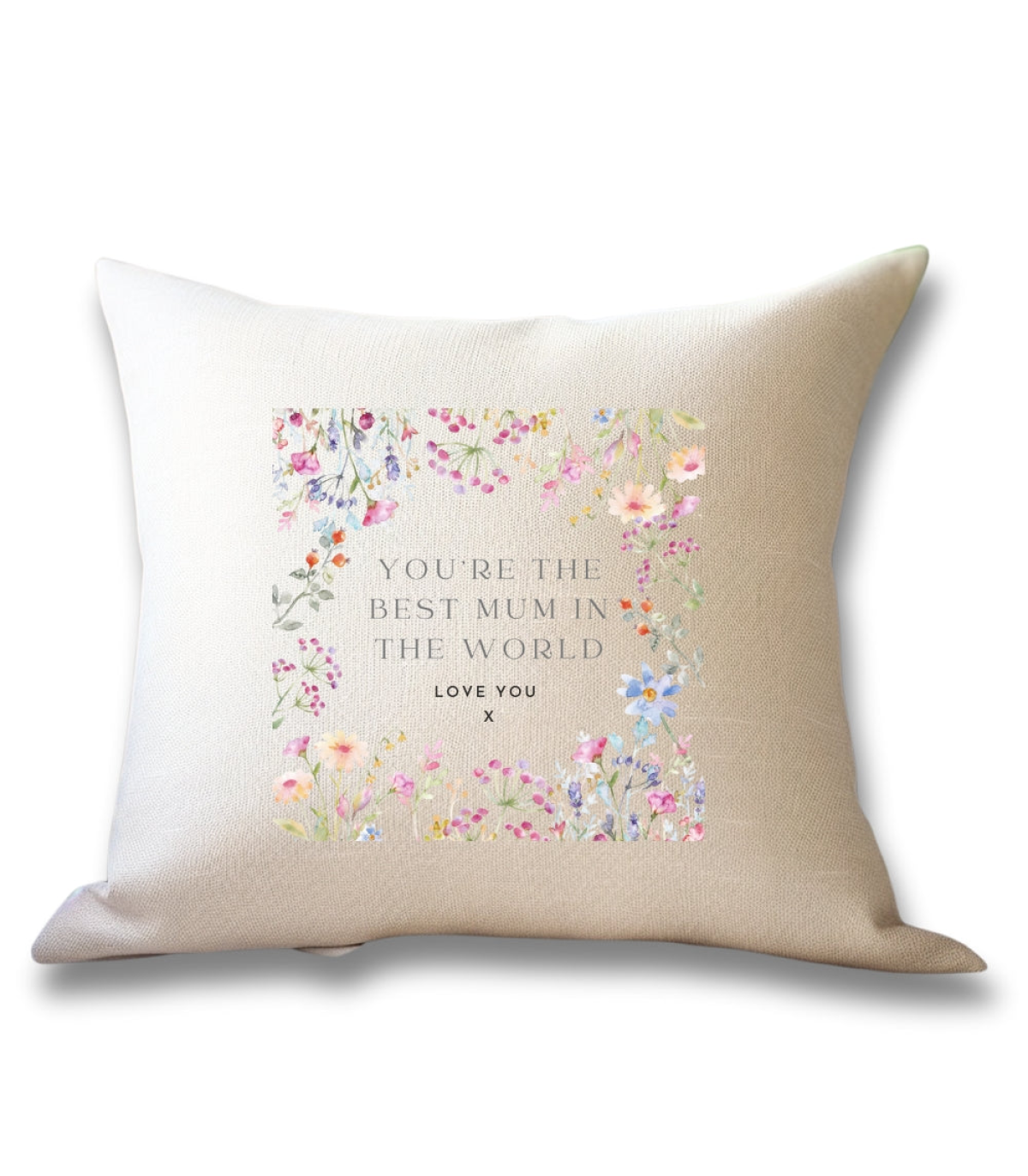 This lovely linen effect cushion comes with the words “You're The Best Mum In The World” surrounded by colourful flowers. This can also be personalised with any other words of your choice. This a pretty gift for your mum's birthday, Mother's Day or Christmas. A thoughtful gift that is also useful and looks pretty as a scatter cushion on a bed or sofa.
