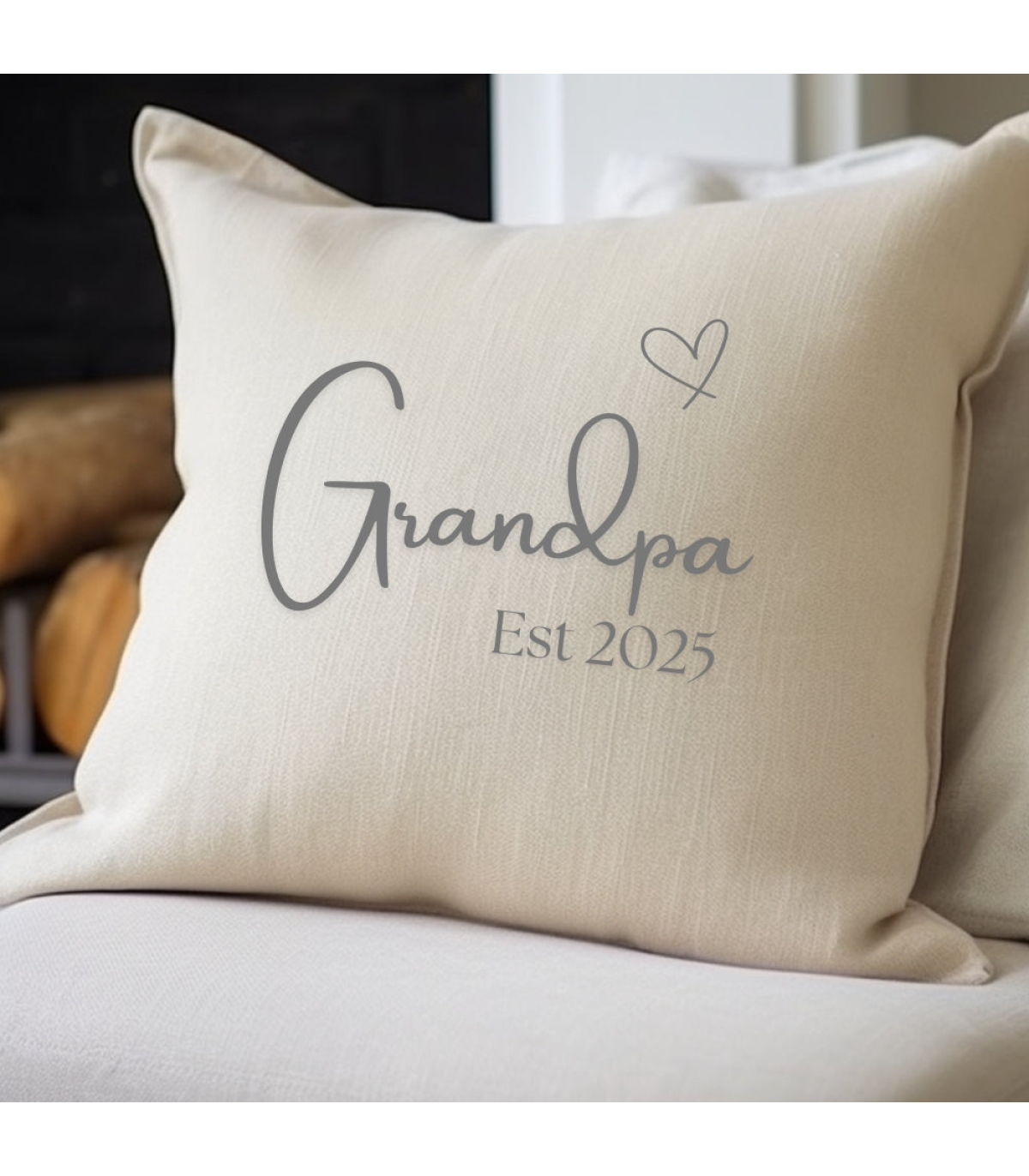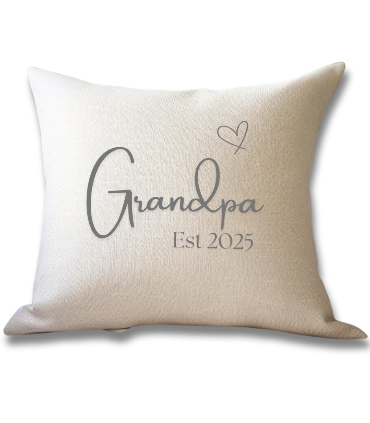 This sweet cushion is made from cream linen effect material with a plain woven texture with a message saying 'Grandpa Est. 2025' design. A gift to congratulate a new Grandpa either as a birthday gift, Father's day or Christmas present.