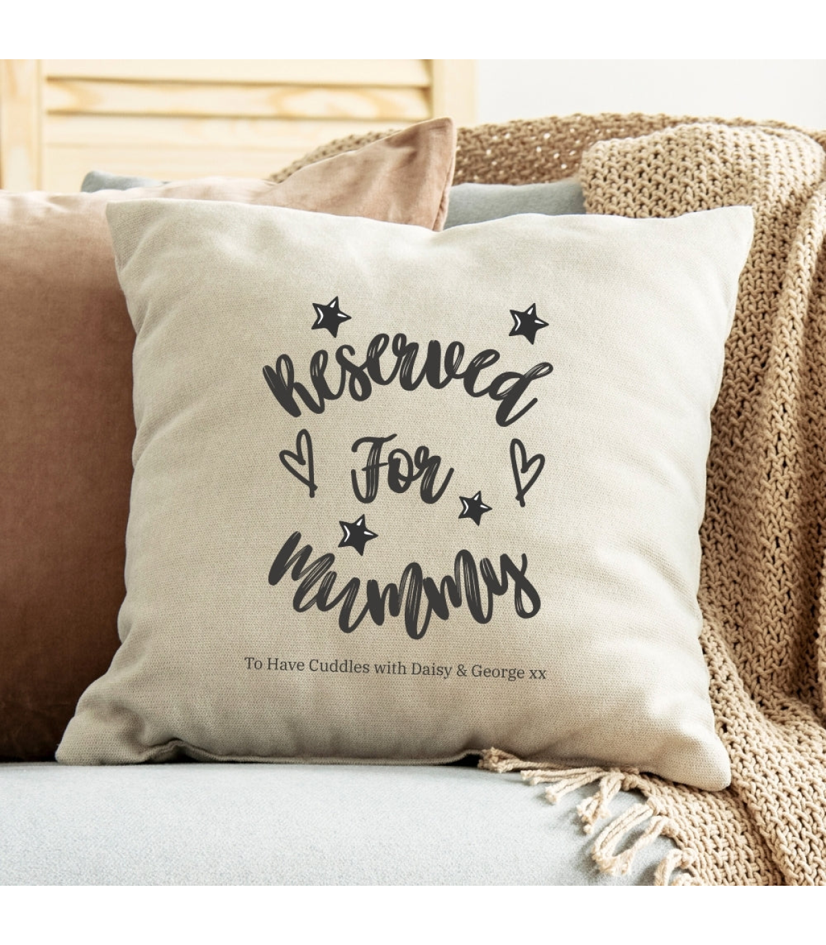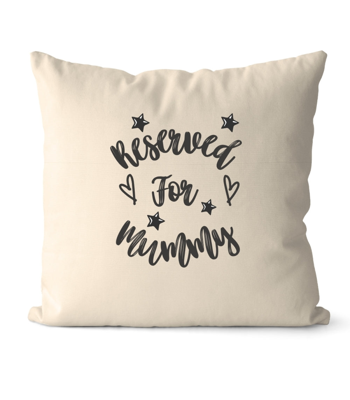 This sweet cushion is made from cream linen effect material with a plain woven texture with a message saying 'Reserved for Mummy' and stars and hearts design. This can also be personalised with any message. A gift to congratulate a new Mummy either as a birthday gift, new mummy present, Mother's day or Christmas present.