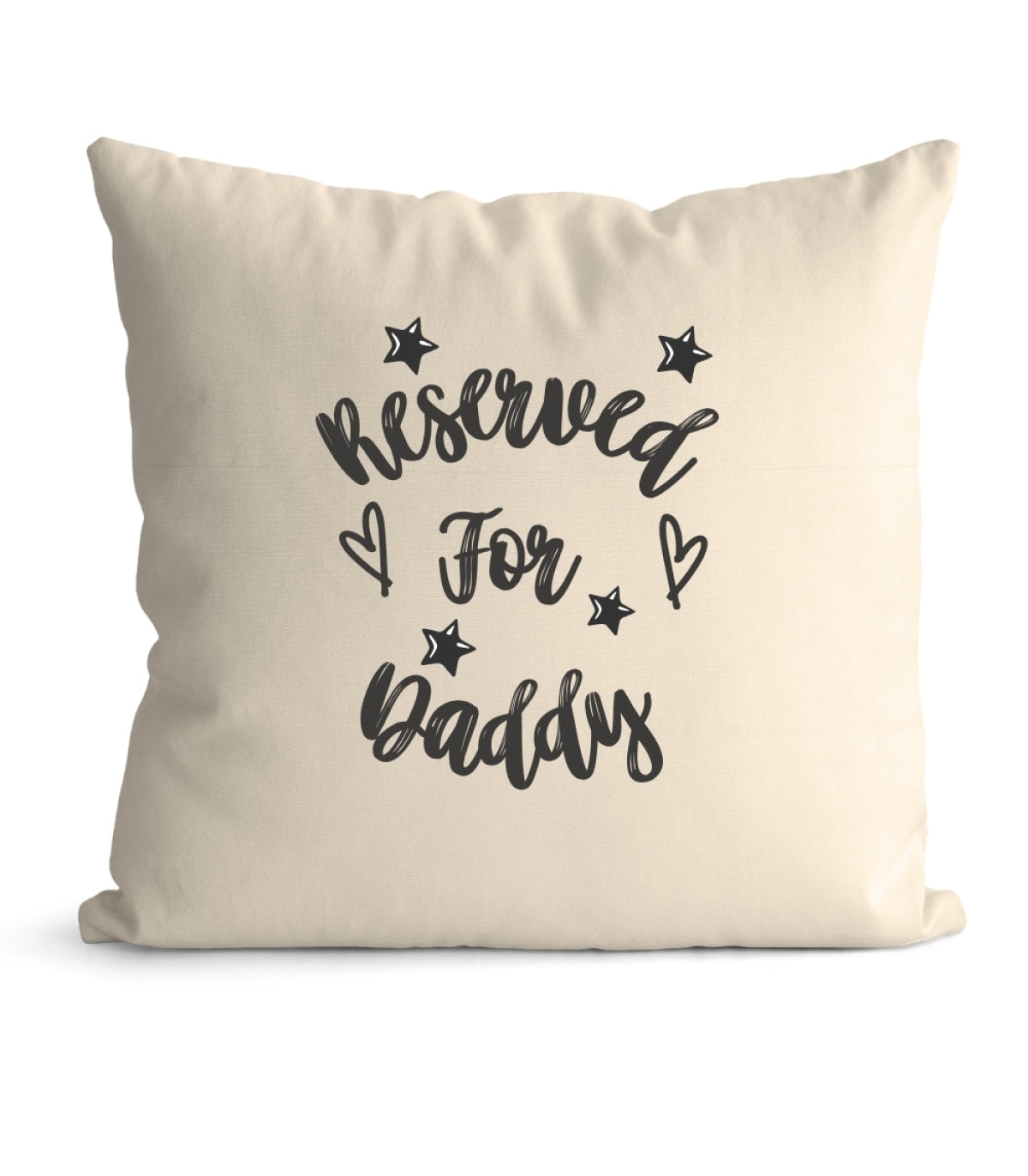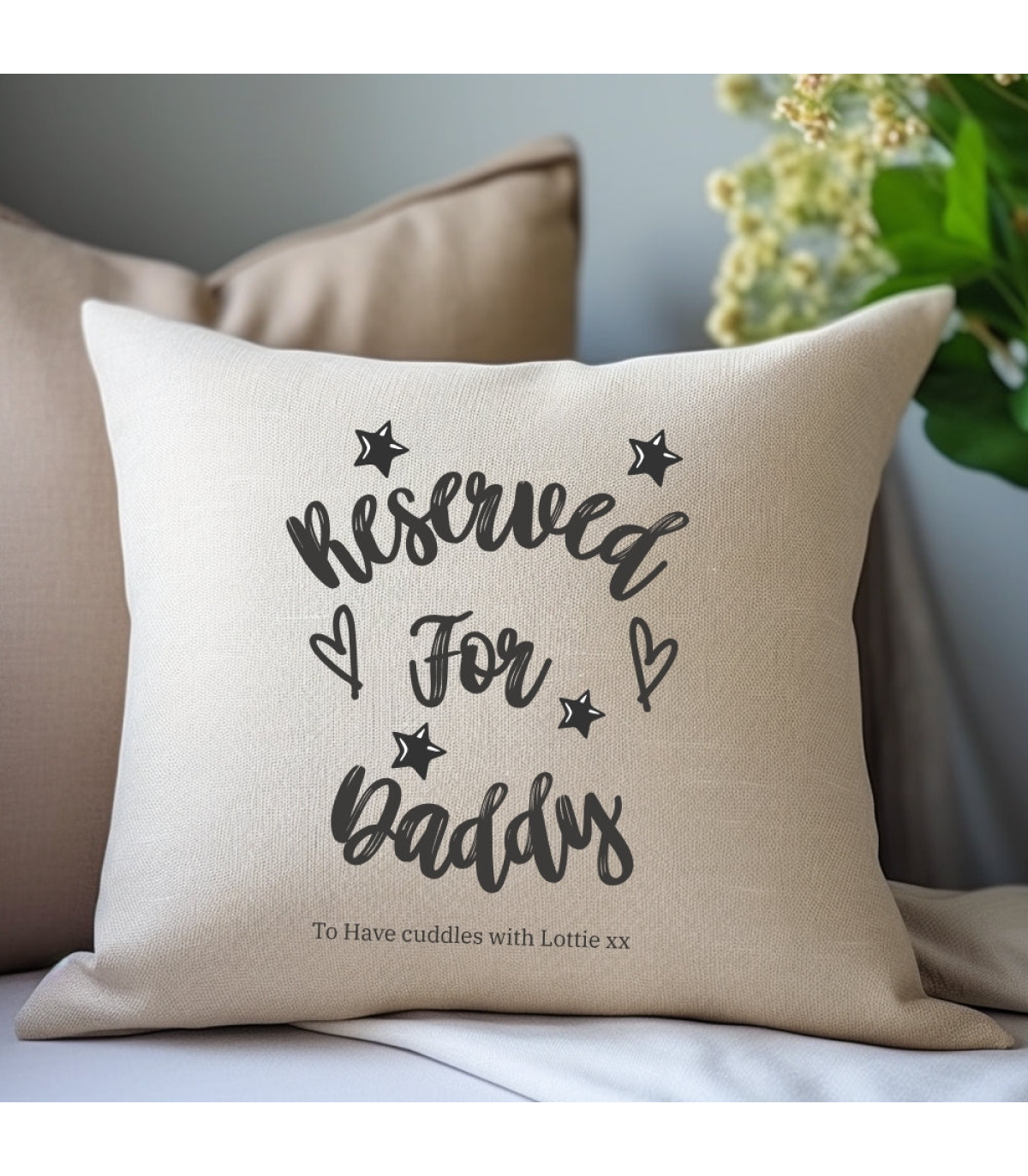 This sweet cushion is made from cream linen effect material with a plain woven texture with a message saying 'Reserved for Daddy' and stars and hearts design. This can also be personalised with any message. A gift to congratulate a new Daddy either as a birthday gift, new daddy present, Father's day or Christmas present.