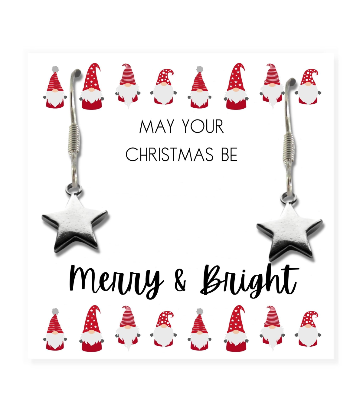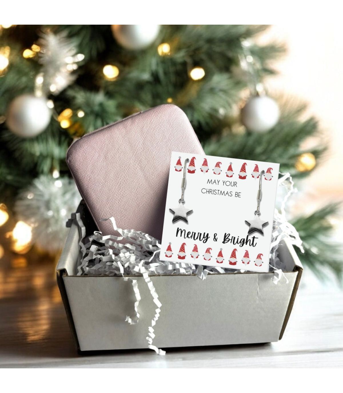 This elegant mini Christmas gift hamper includes silver star earrings, presented on a message card with the phrase "May your Christmas be. Merry & Bright". Additionally, the set comes with a lovely pink square jewellery box, this small design is perfect for a starter jewellery box or for travelling. Perfect for mums, a sister, daughter, aunty, or grandmother, this pretty gift offers a small section for a personal note or the choice to keep it blank.
