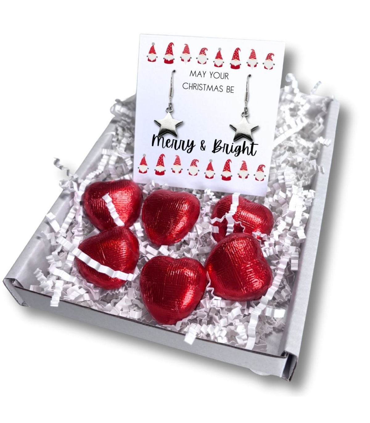 Our mini gift hamper includes star silver earrings, presented on a message card with the phrase "May your Christmas be. Merry & Bright". Additionally, the set comes with delicious milk chocolate hearts. Perfect for mothers, sisters, daughters, aunties, friends or grandmothers, this delightful gift offers a small section for a personal note or the choice to keep it blank. Perfect for a secret Santa Gift too.