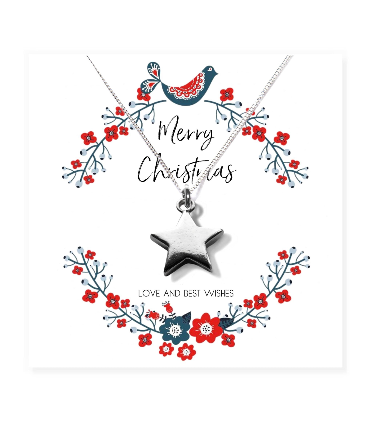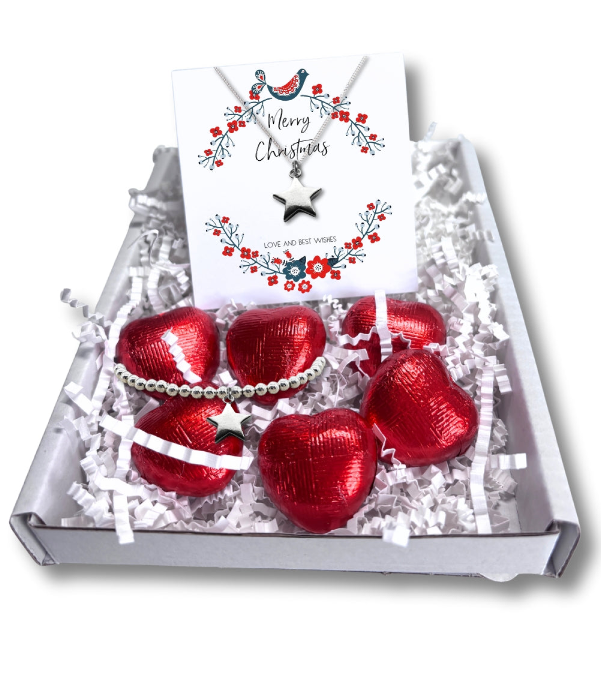 Our mini gift hamper includes silver star charm necklace, presented on a message card with the phrase "Merry Christmas, Love and Best Wishes". Additionally, the set comes with delicious milk chocolate hearts. Perfect for mothers, sisters, daughters, aunties, friends, neighbours or grandmothers, this delightful gift offers a small section for a personal note or the choice to keep it blank. Perfect for a secret Santa Gift too.