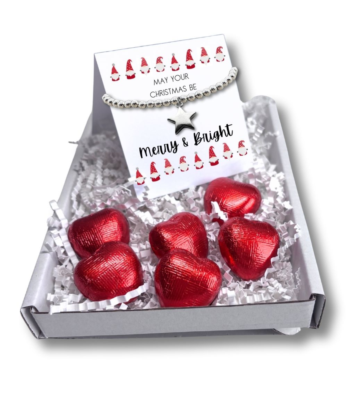Our mini gift hamper includes silver star charm bracelet, presented on a message card with the phrase "May your Christmas be. Merry & Bright". Additionally, the set comes with delicious milk chocolate hearts. Perfect for mothers, sisters, daughters, aunties, best friends, neighbours or grandmothers, this delightful gift offers a small section for a personal note or the choice to keep it blank. Perfect for a secret Santa Gift too.