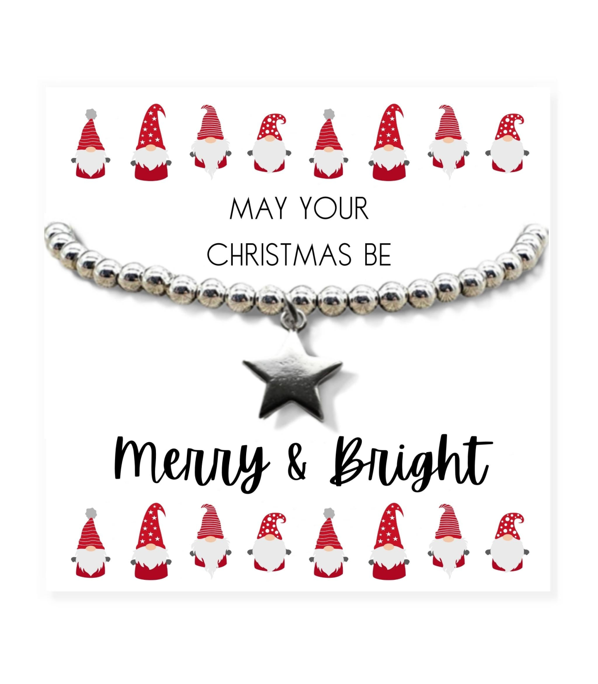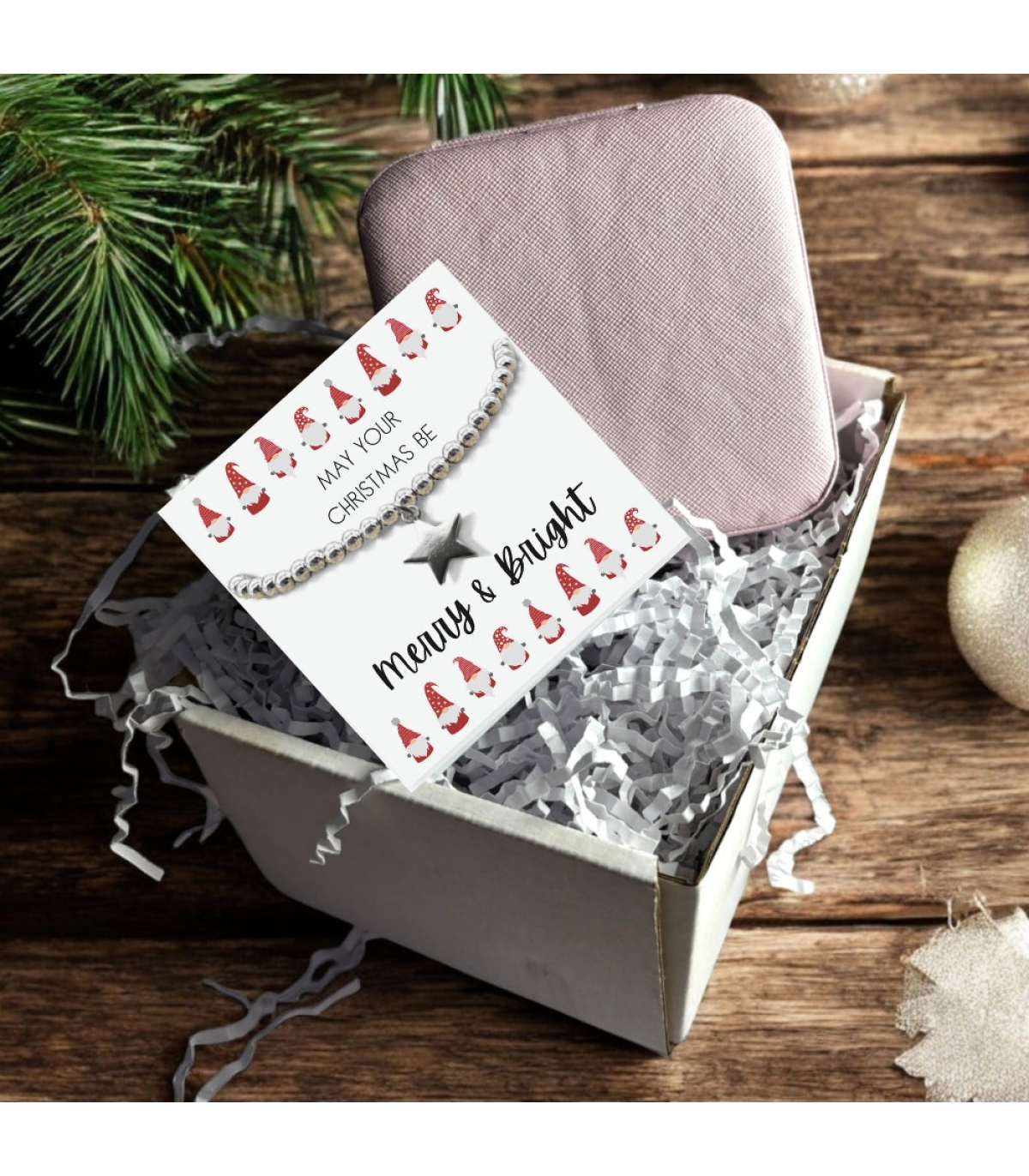 This elegant small Christmas gift hamper includes a bracelet with a silver star charm, presented on a message card with the phrase "May your Christmas be. Merry & Bright". Additionally, the set comes with a lovely pink square jewellery box, this small design is perfect for a starter jewellery box or for travelling. Perfect for mums, a sister, daughter, aunties, friends, teachers or grandmother, this pretty gift offers a small section for a personal note or the choice to keep it blank.
