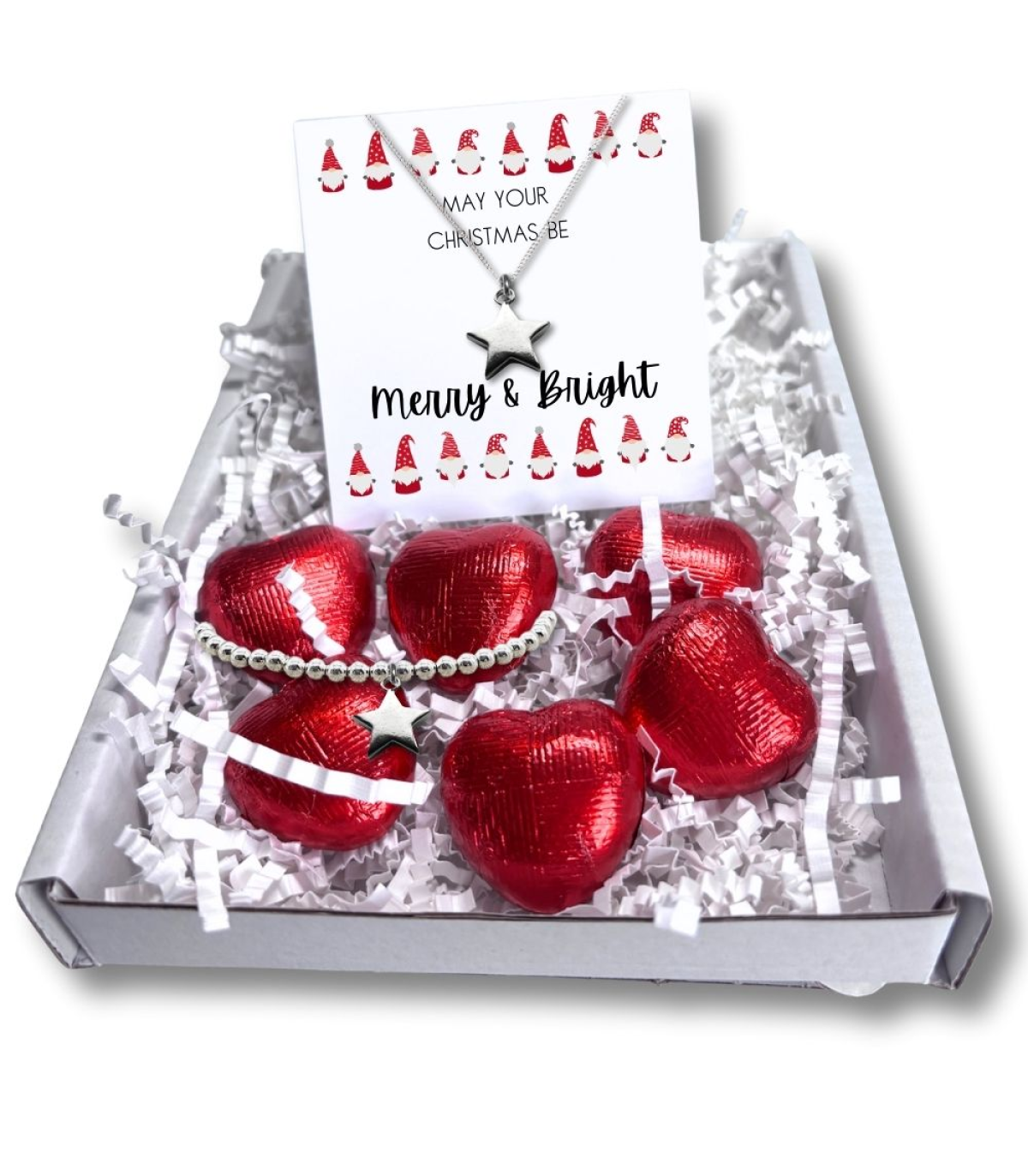 Our mini gift hamper includes silver star charm necklace, presented on a message card with the phrase "May your Christmas be. Merry & Bright". Additionally, the set comes with delicious milk chocolate hearts. Perfect for mothers, sisters, daughters, aunties, friends, neighbours or grandmothers, this delightful gift offers a small section for a personal note or the choice to keep it blank. Perfect for a secret Santa Gift too.