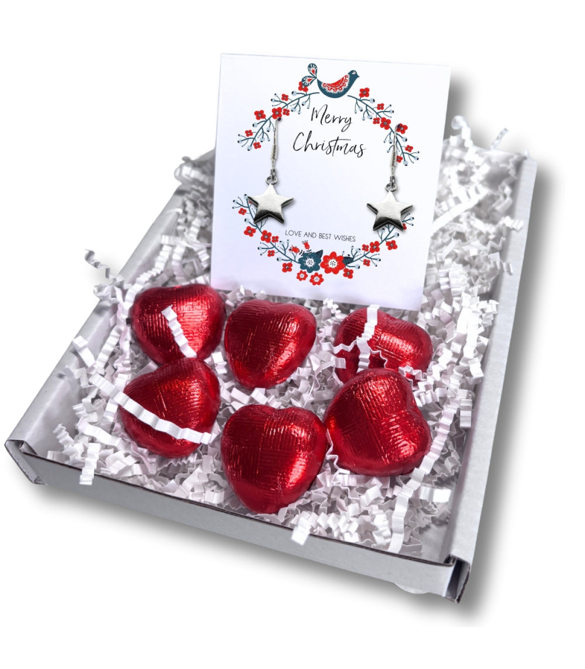Our mini gift hamper includes star silver earrings, presented on a message card with the phrase "Merry Christmas, Love and Best Wishes". Additionally, the set comes with delicious milk chocolate hearts. Perfect for mothers, sisters, daughters, aunties, friends or grandmothers, this delightful gift offers a small section for a personal note or the choice to keep it blank. Perfect for a secret Santa Gift too.