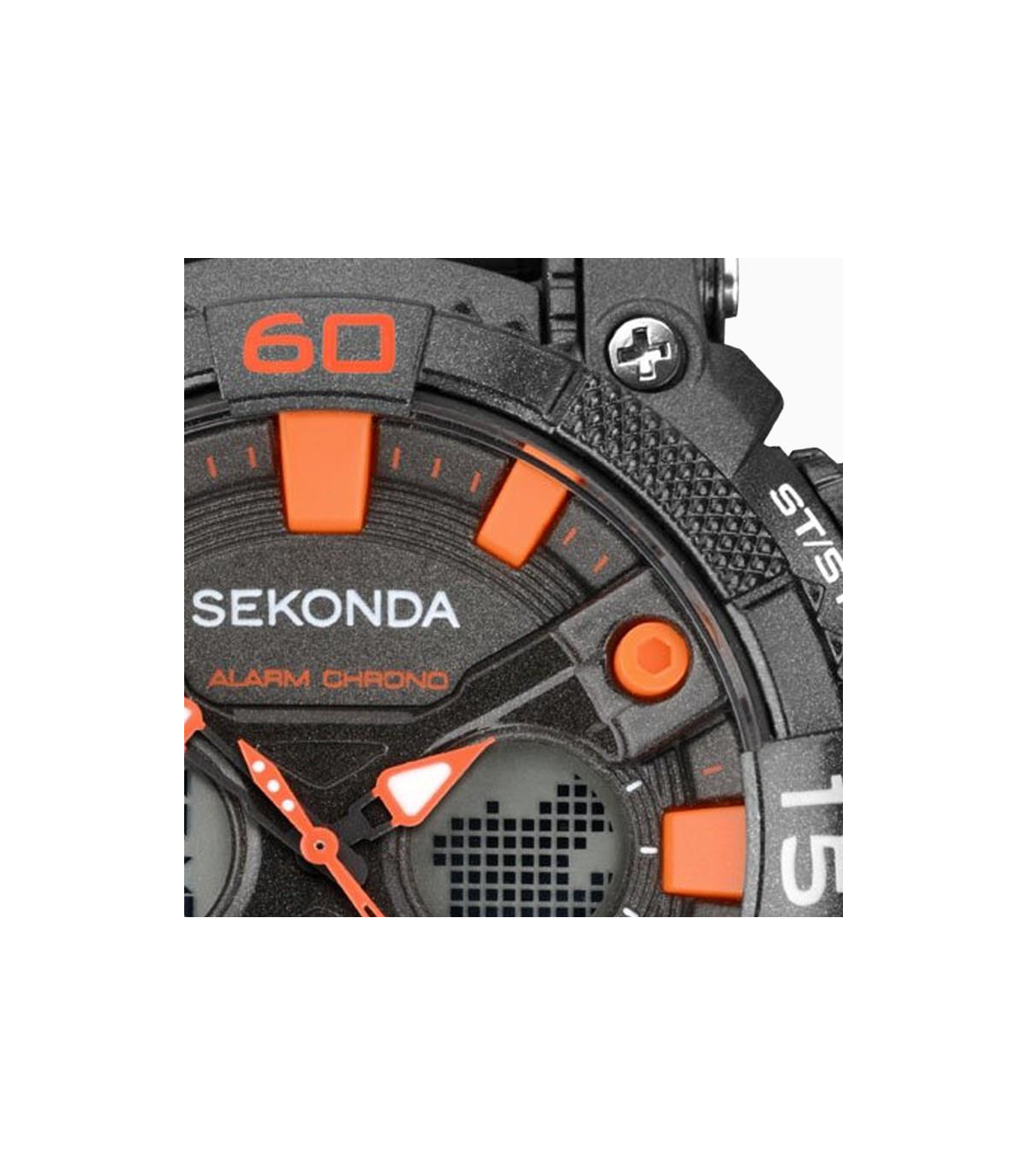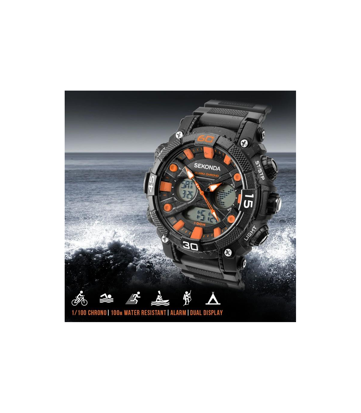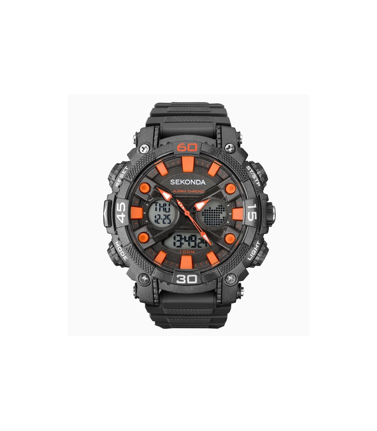 Sekonda 1037 is a super handsome Gents watch. This durable men’s digital watch features a black plastic case enclosing a matching black dial with vibrant orange features. The watch is fastened with a dark grey plastic strap and has functions including 1/100th second chronograph timing, a countdown timer, 5 alarms, dual-time and calender, and water resistance to 100m. The perfect men's sports watch. We ship it with an original box and a guarantee from the manufacturer.