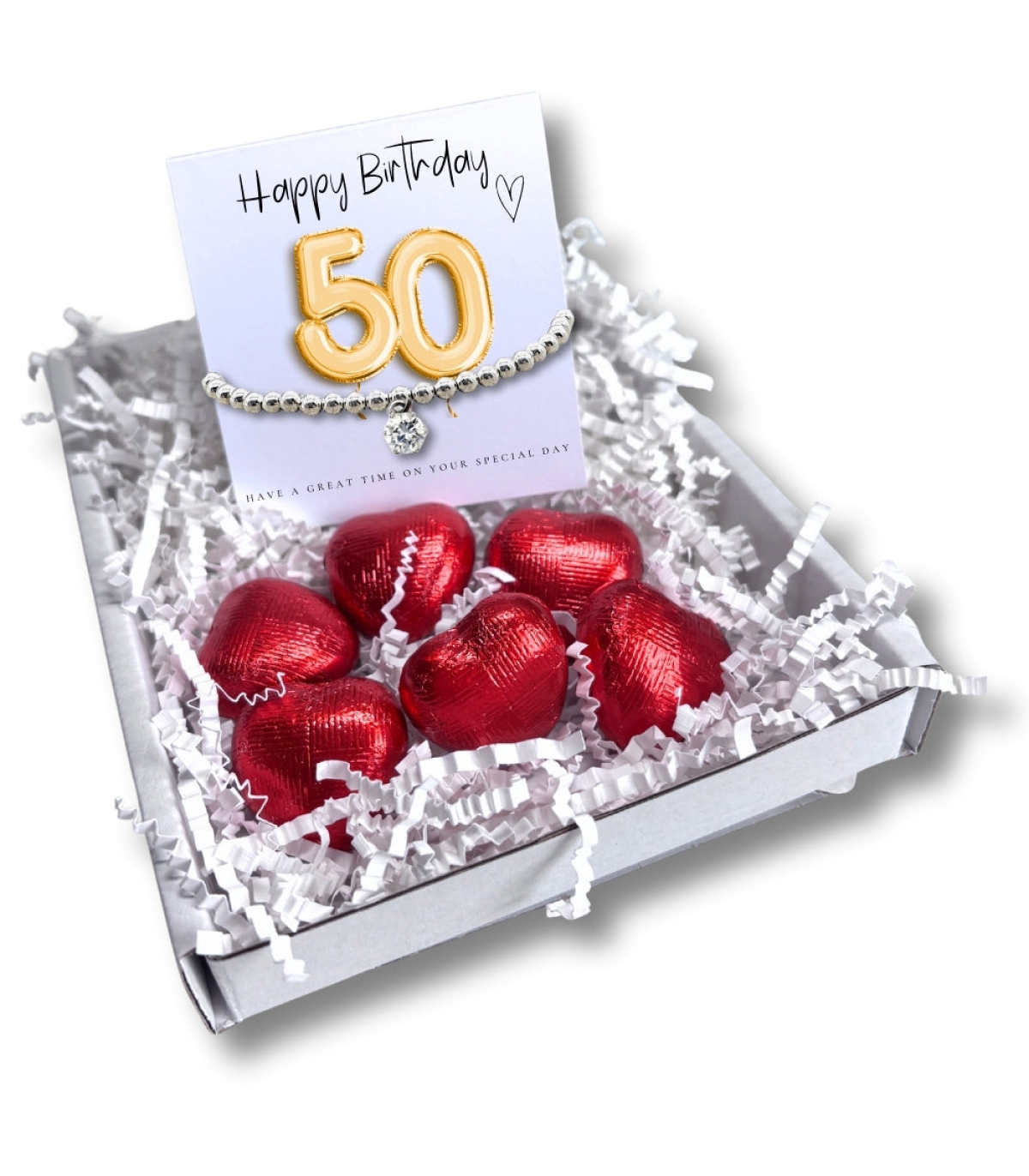 Make the 50th birthday of a special someone with our cubic zirconia beaded stretch bracelet on a gold balloons message card and comes with delicious milk chocolate hearts. This lovely bracelet is a great gift for the birthday girl. Choose to add a special message or send blank, either way, it's a gift that will be cherished for years to come.