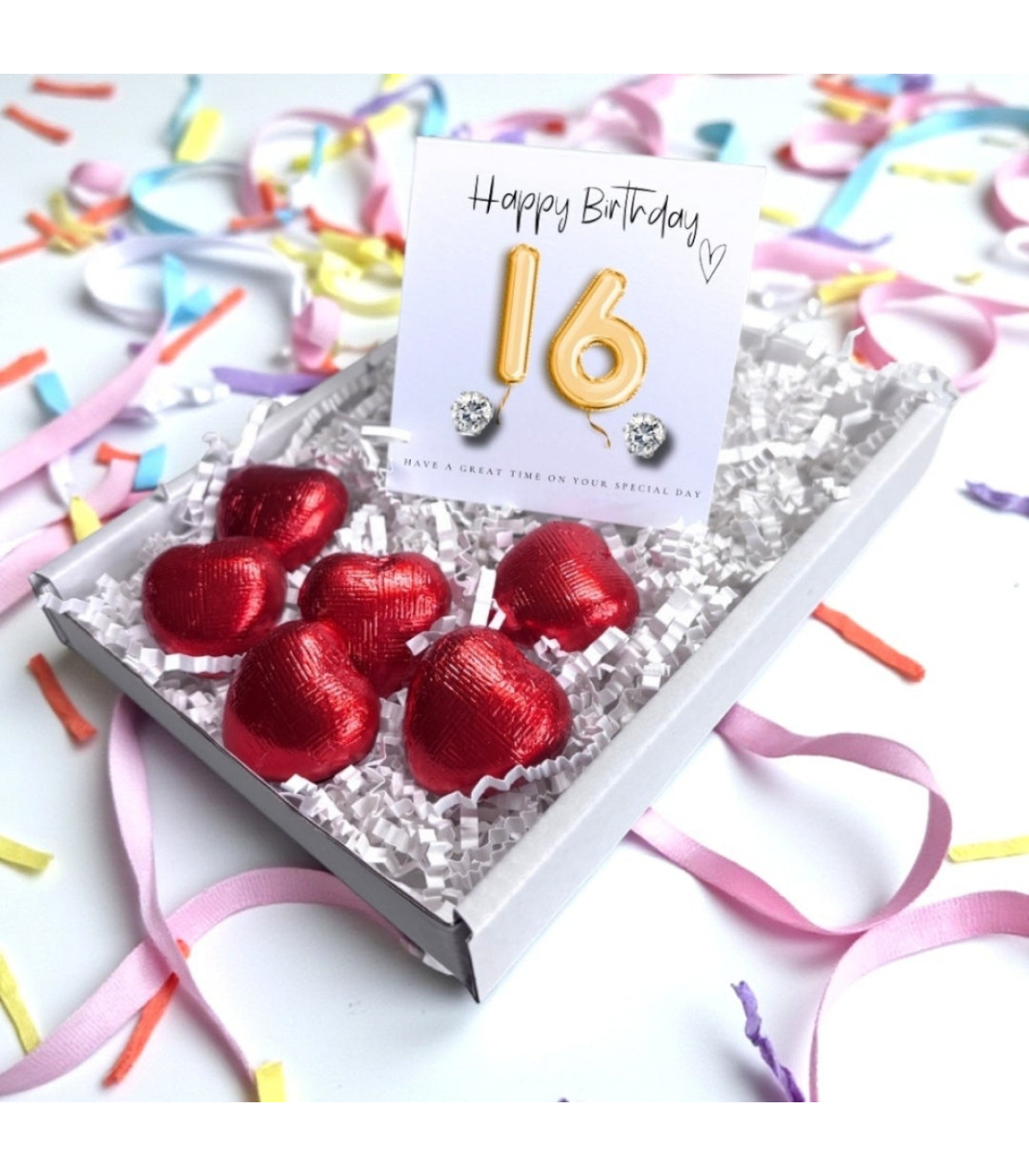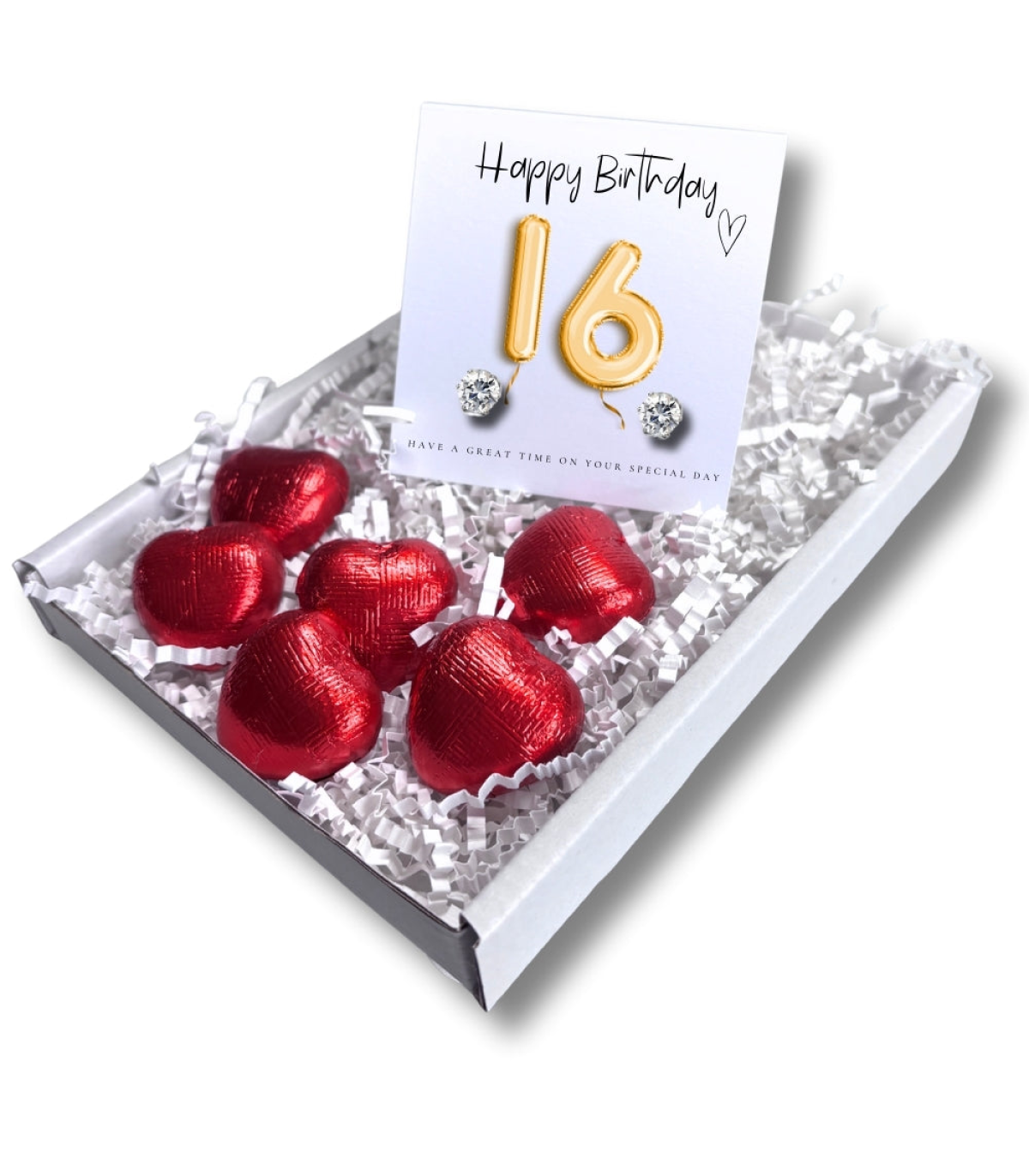 Make the 16th birthday of a special someone truly unique with our exquisite earrings on a gold balloons message card and comes with six delicious milk chocolate hearts. These stunning cubic zirconia stud earrings are a perfect gift for her birthday, plus, they're hypoallergenic for sensitive ears. Choose to express your feelings with a special message or let their beauty speak for itself, either way, it's a gift that will be cherished for years to come.