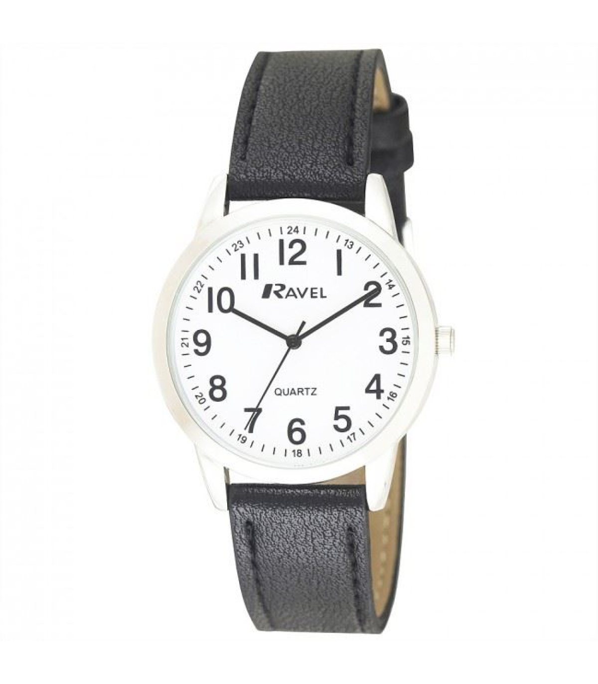 Ravel Men's Classic Leather Strap Watch R0132.21.1 Super-clear face - bold black numbers and hands on a white face Black leather-look strap with chrome finish buckle Accurate, reliable quartz movement Long-life silver oxide battery 12-month manufacturer's guarantee