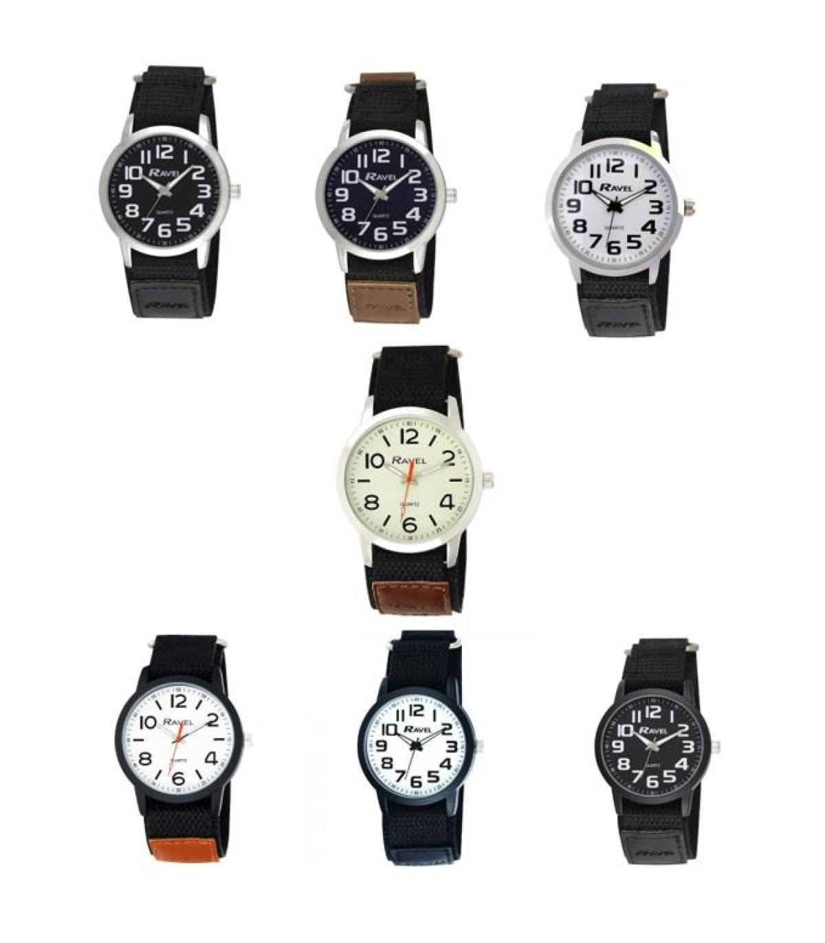 The Ravel Mens Velcro R1601 series provides the perfect watch for work and play. With their full bold arabic dials complete with minute track, the time can be read easily and quickly. The R1601 Velcro strap and sporty looking case with decorative top ring fit on the wrist comfortably whilst also being robust. Consistently good sellers!