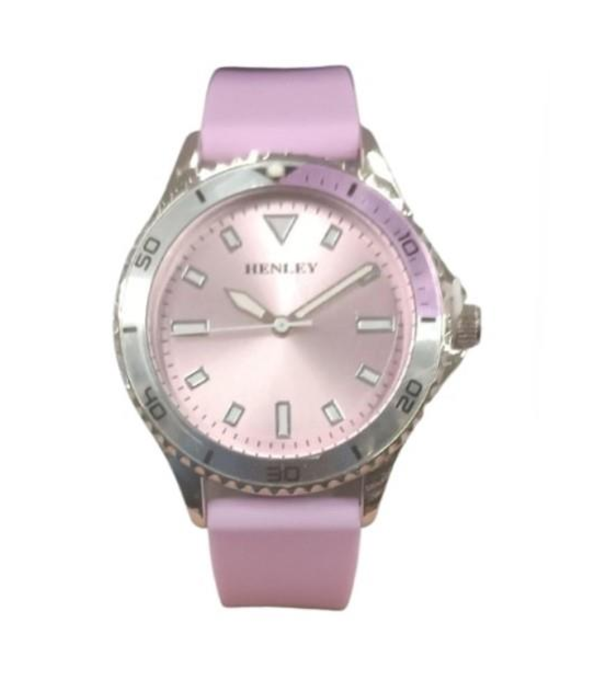 H06188 ladies silicone sports watch featuring aluminium top ring with a contrasting colour co-ordinated detail. Sunray sports dial with silver sports hands and contrasting second hand. The smooth pastel green soft silicone strap, is a must have accessory. Available in white, pink, blue and green.