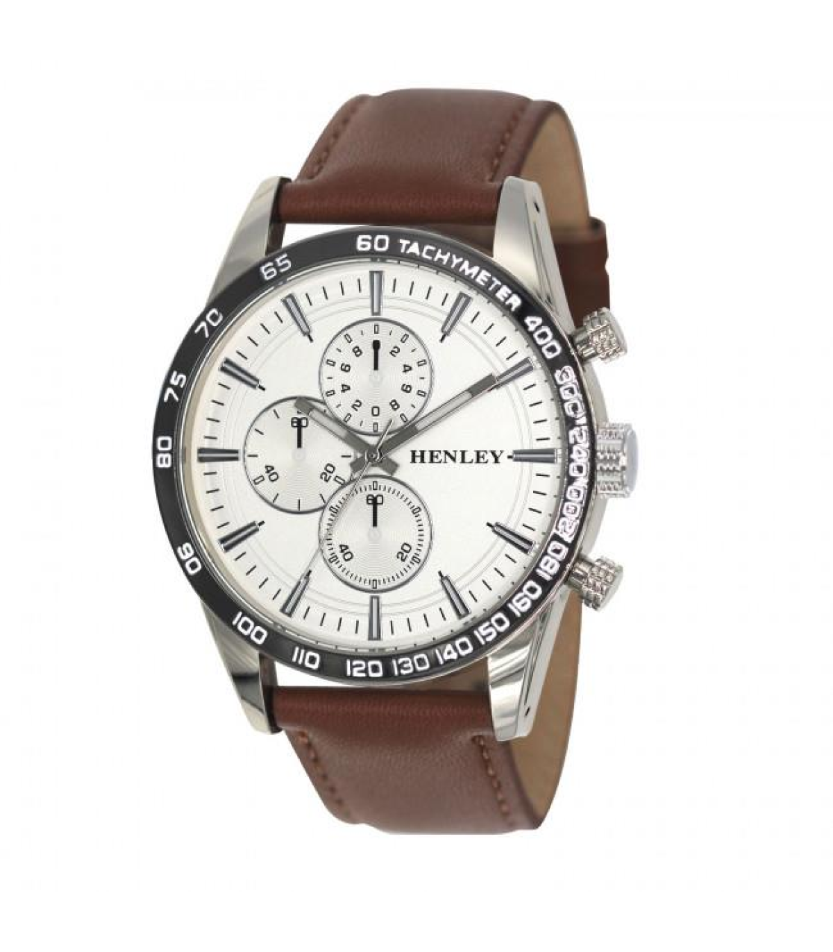 Henley Mens Polished Silver Sports Multi Eye White Dial Brown Leather Strap Watch H03016.2