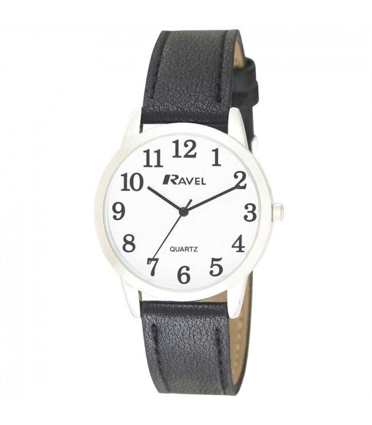Polished Round Case - 36mm. Bold Easy Read Arabic Dial. Straight Pointer Hands Stitched Faux Leather Strap. Quality Quartz Movement Packed in Ravel PVC Hanging Pouch with Guarantee Card.