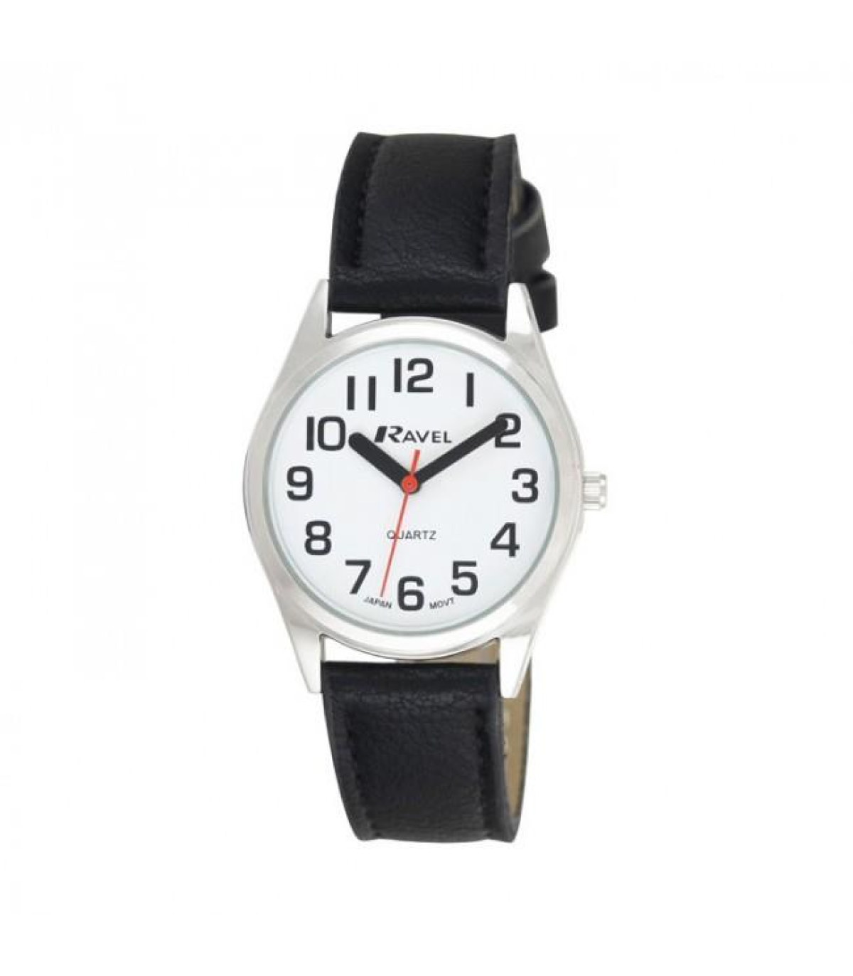 Ravel Unisex R0125.01.1 Easy Read Classically Styled Watch with Bold Hands and Bold Numbers on PU Strap Quartz Watch with White Dial Analogue Display. Polished Round Case Super Bold Easy Read Dial Super Bold Easy Read Hands Croco Pattern Stitched PU Strap Polished Round Case - 31mm. Super Bold Easy Read Arabic Dial. Super Bold Easy Read Hands Stitched Faux Leather Strap. Japan Quartz Movement Packed in Ravel PVC Hanging Pouch with Guarantee Card.