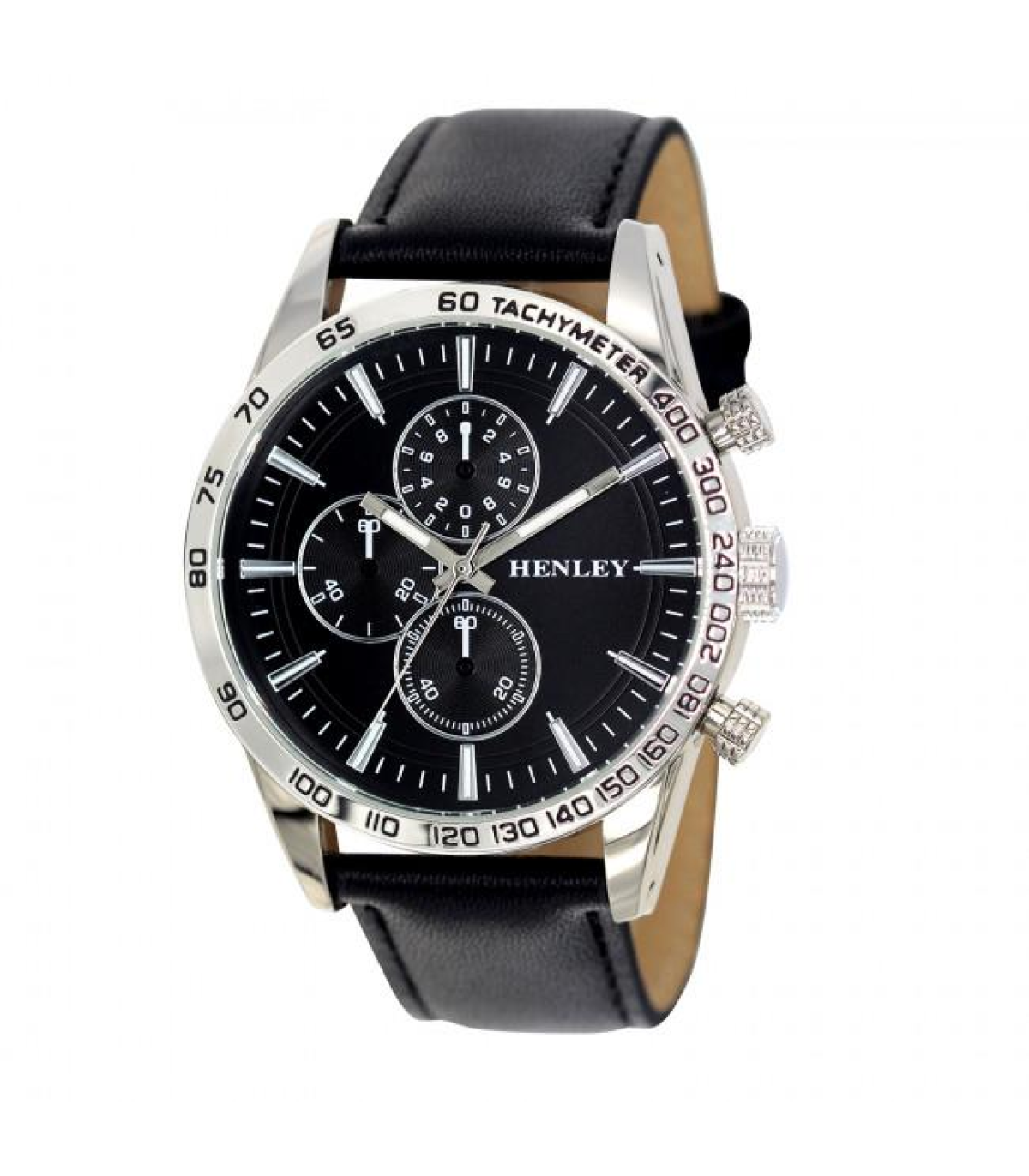 H03016 is a must have polished silver tone sports watch with silver decorative push buttons. This watch has a colour co-ordinated dial which is enhanced by macthing cd cut decorative mini dials. Silver sports hands with white infill and silver second hand to complete the sport look. Comfortable semi padded faux leather strap with coloured stitching. Available in silver/brown, black, blue and orange.