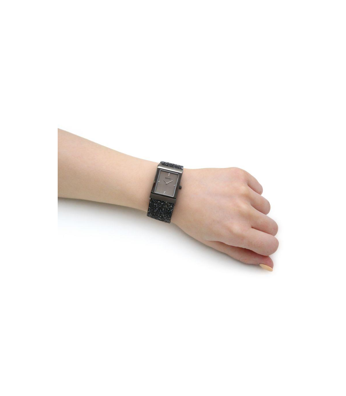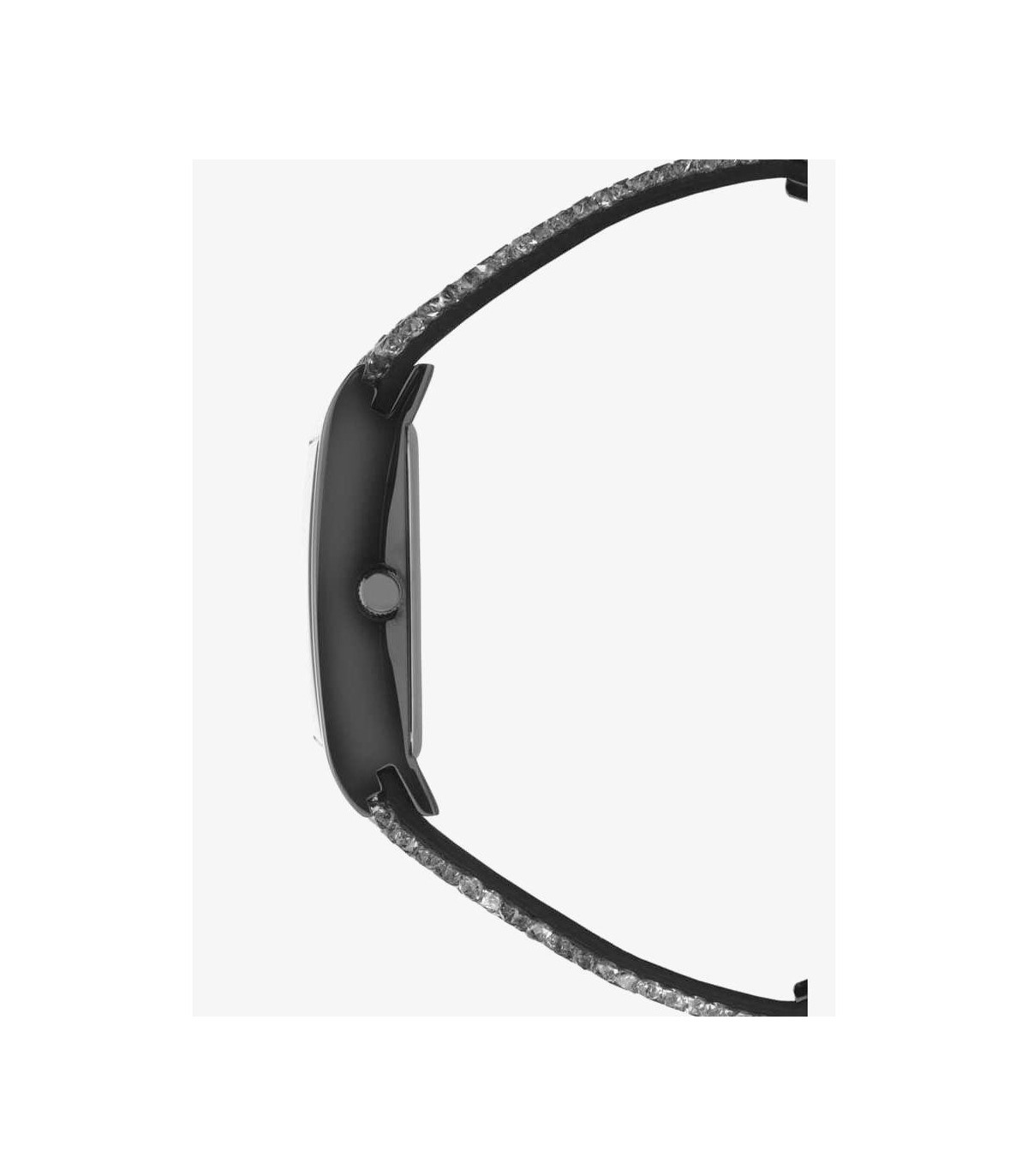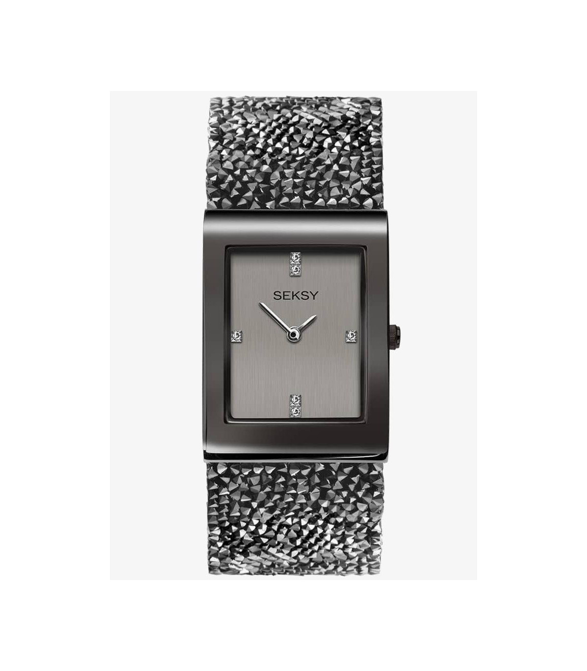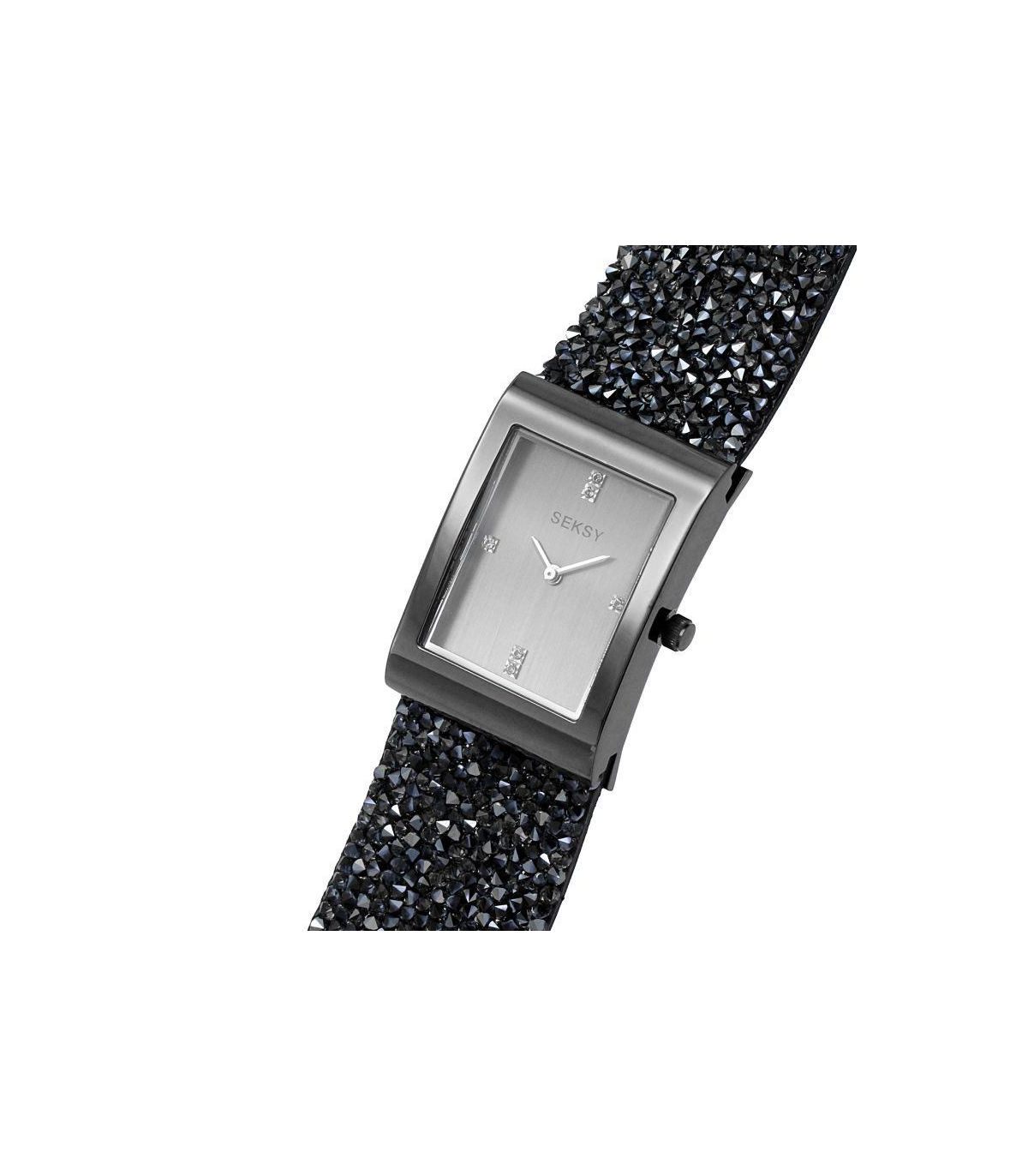 Seksy Rocks® Ladies Watch Grey Case & Leather Strap with Grey Dial 2654 A Gunmetal plated case housing a contemporary slate grey stone set dial. The watch fastens with a gunmetal plated bracelet and black leather strap set with crystal fine rocks. We ship it with an original box and a guarantee from the manufacturer.
