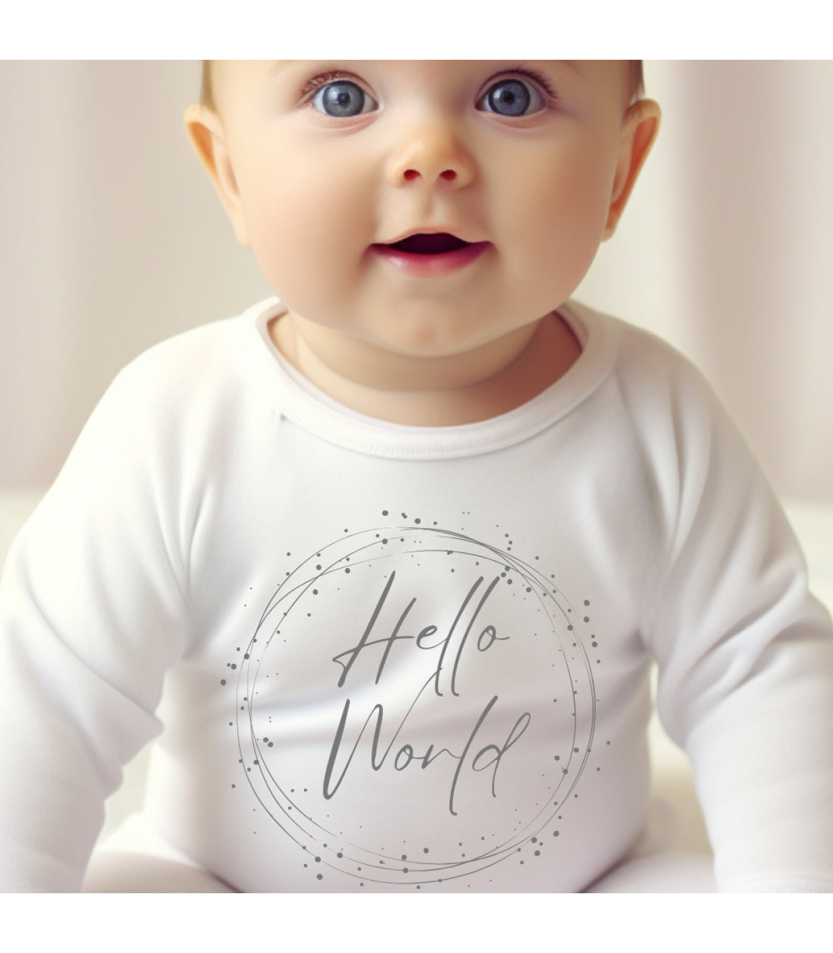 Our Hello World baby clothing suit makes a sweet gift for a new born baby and can be kept as a lovely keepsake too for the new mum & dad. A modern simple design with a pale grey print.