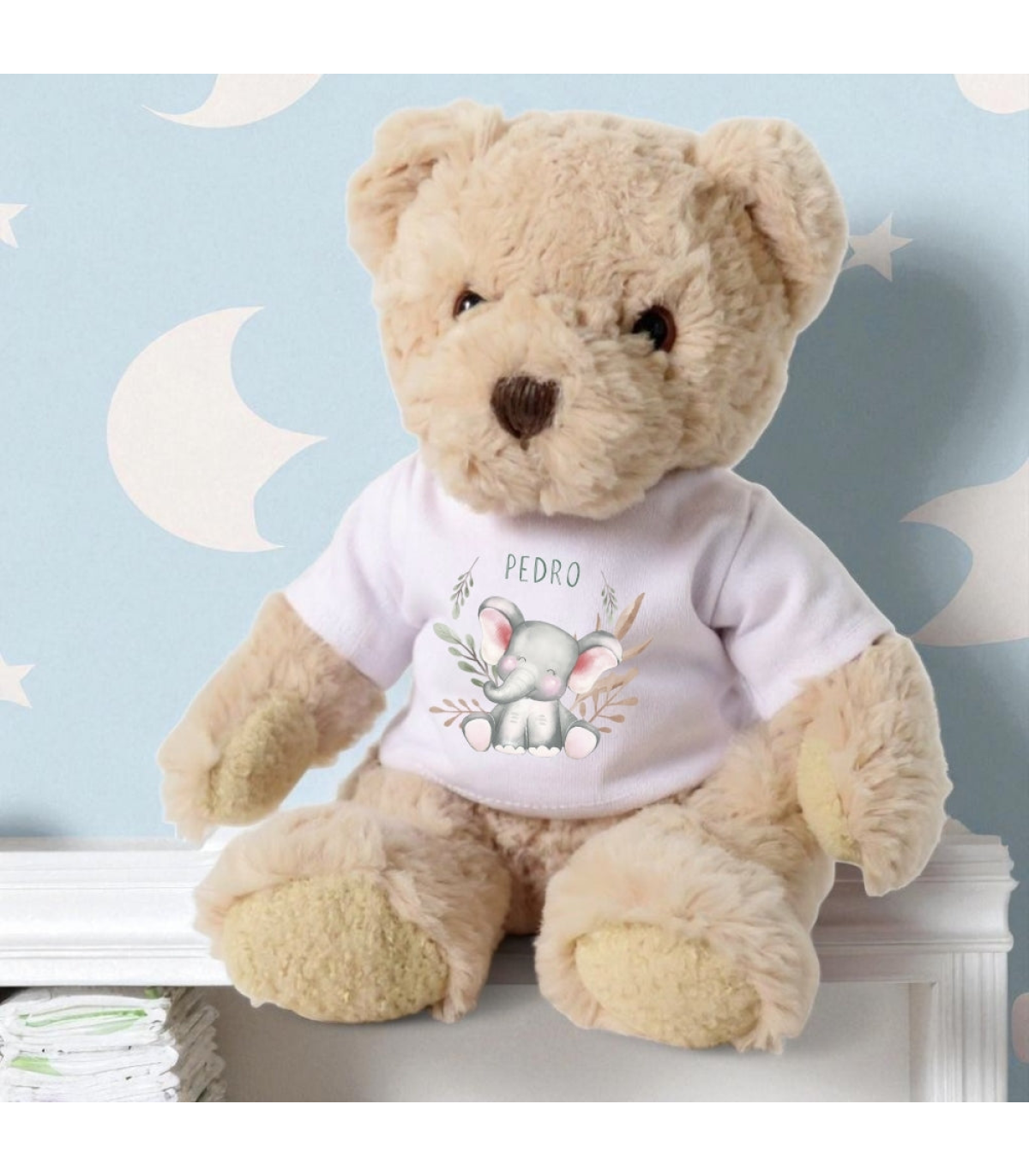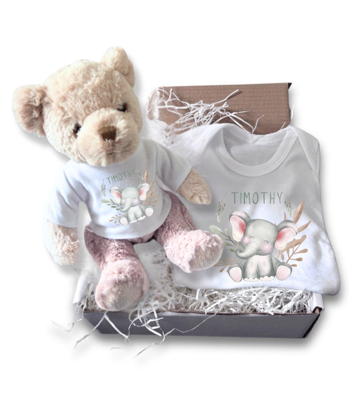 This Happy Elephant Gift Hamper features an adorable teddy bear dressed in a white t-shirt paired with a matching baby vest. Both items showcase a cute elephant design accompanied by any name you choose. It makes an excellent and thoughtful newborn gift for welcoming a special little one.