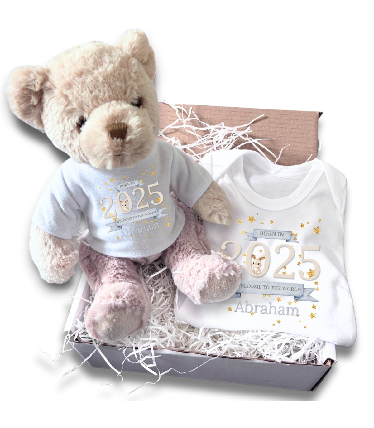This Welcome to the World 2025 Gift Hamper features an adorable teddy bear dressed in a white t-shirt paired with a matching baby vest. This gorgeous design has banners saying 'Born in 2025, Welcome to the World' with a cute bunny rabbit and gold stars and comes with a name of your new baby. It makes an excellent and thoughtful gift to announce the arrival of your newborn baby.
