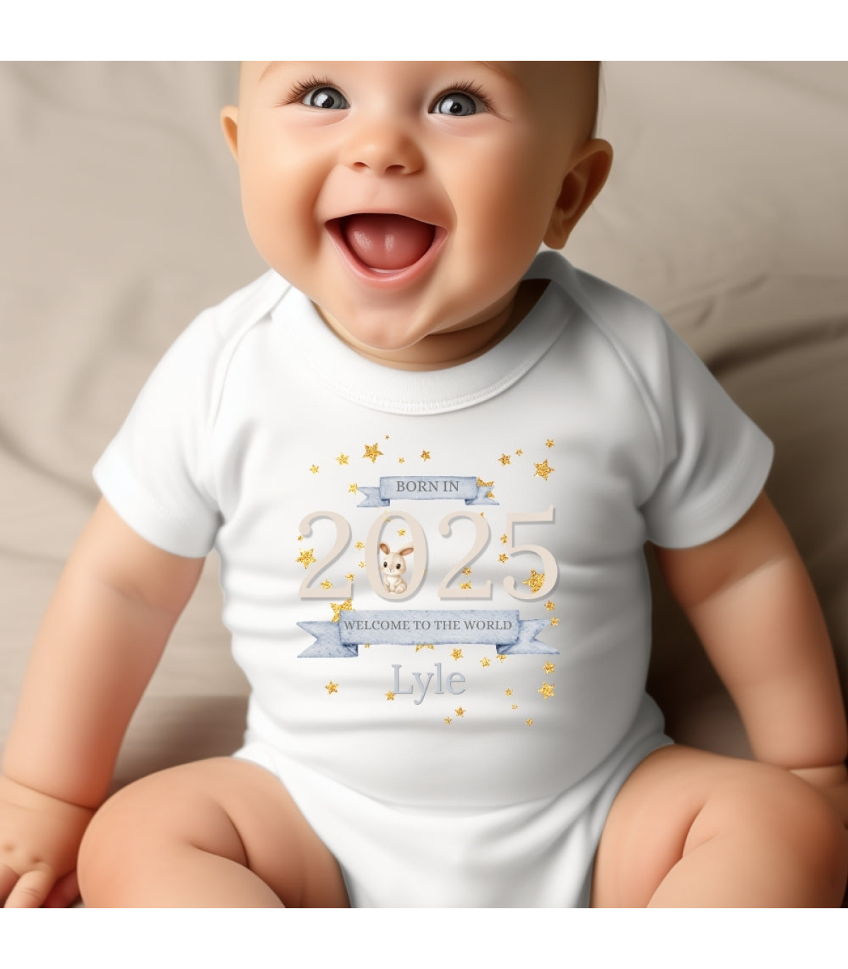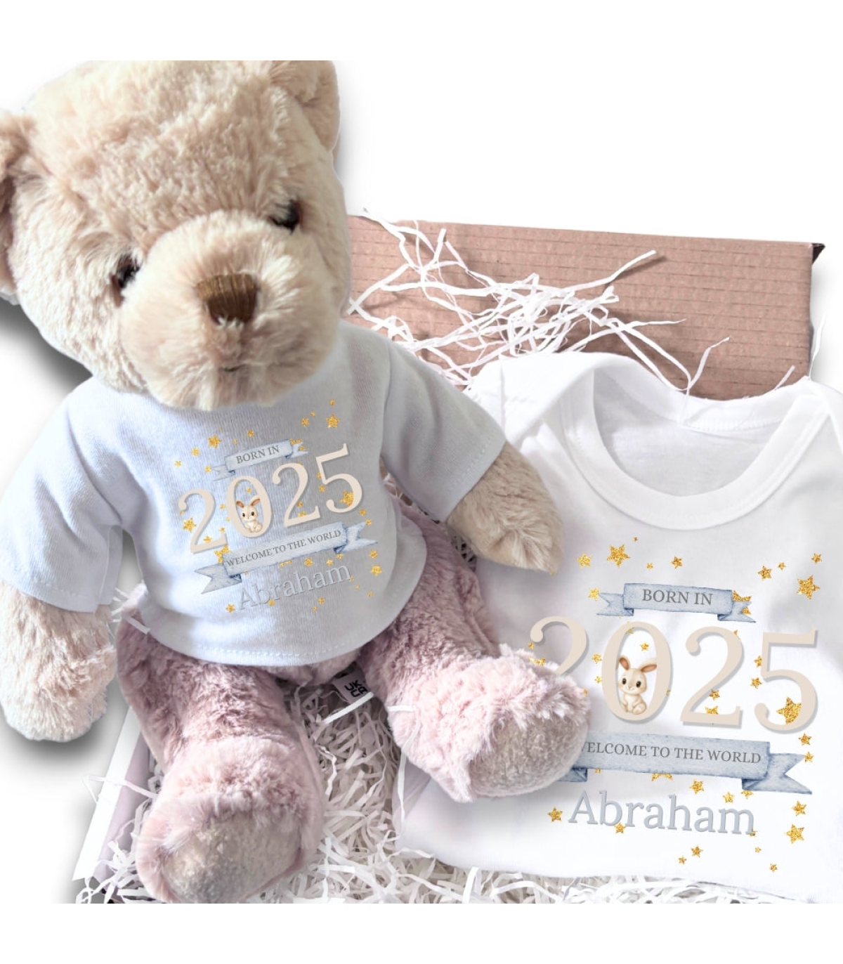 This Welcome to the World 2025 Gift Hamper features an adorable teddy bear dressed in a white t-shirt paired with a matching baby vest. This gorgeous design has banners saying 'Born in 2025, Welcome to the World' with a cute bunny rabbit and gold stars and comes with a name of your new baby. It makes an excellent and thoughtful gift to announce the arrival of your newborn baby.
