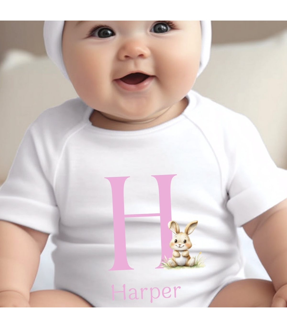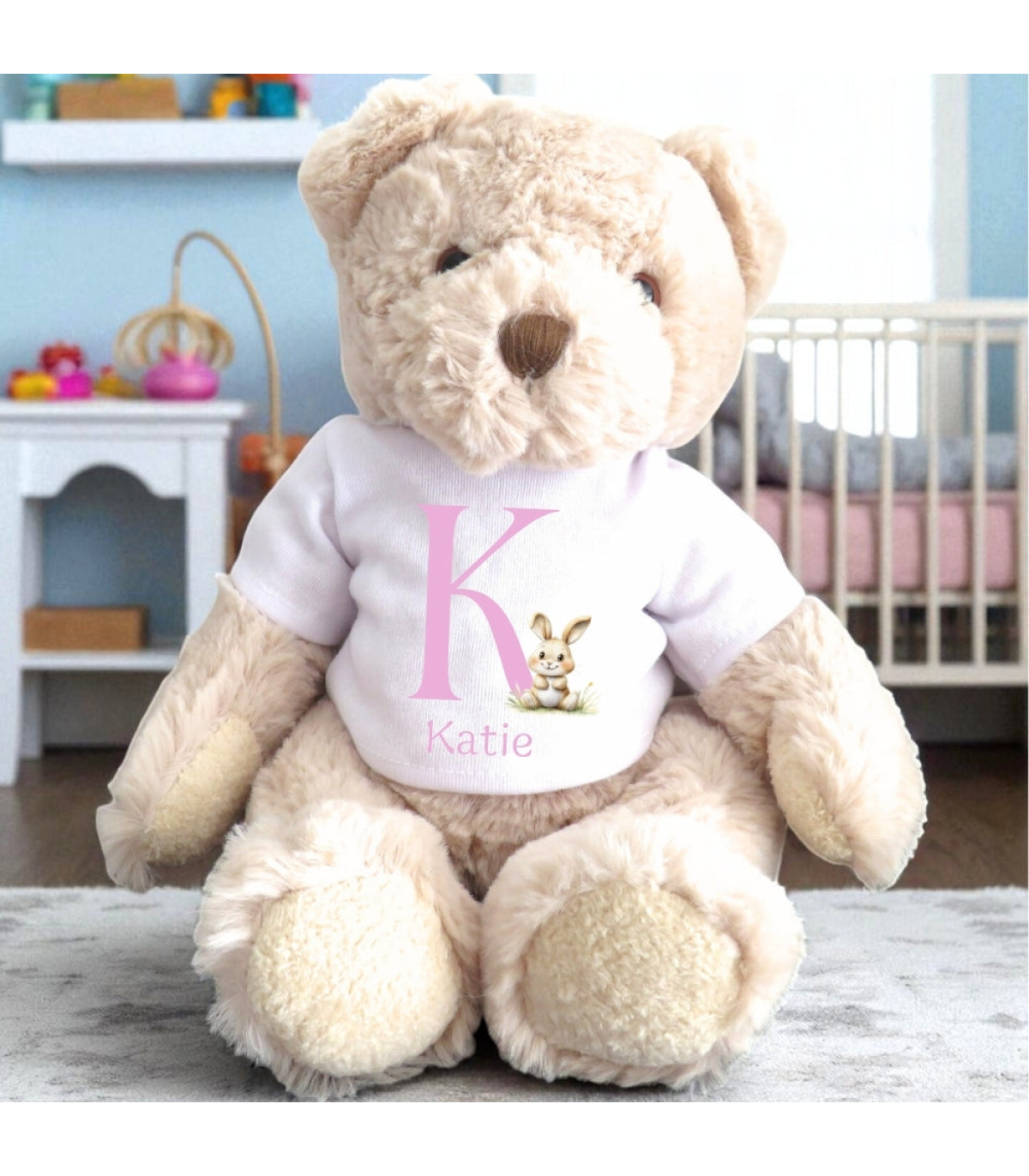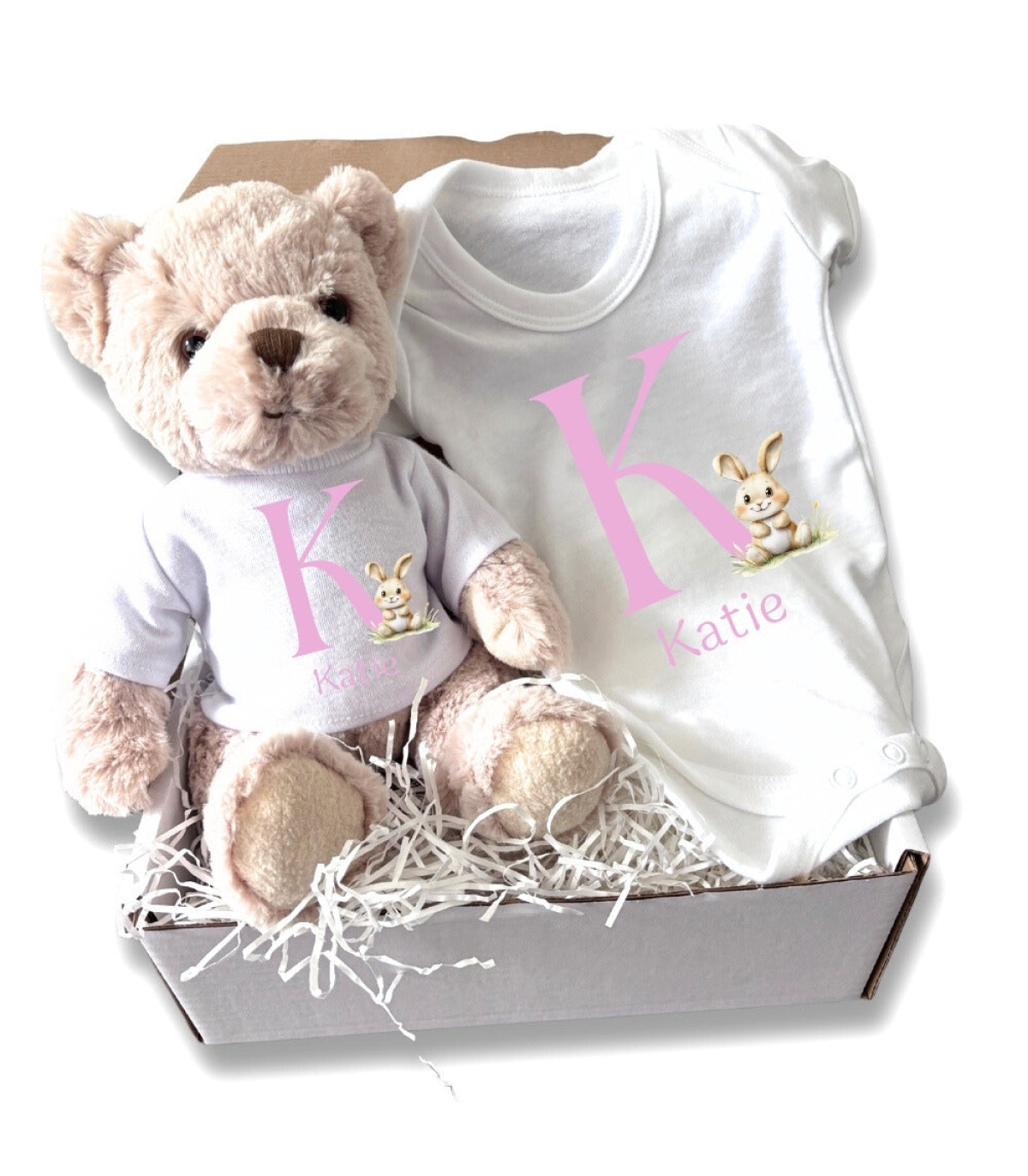 This Pink Initial Bunny Gift Hamper features an adorable teddy bear dressed in a white t-shirt paired with a matching baby vest. This design has a pink initial with a personalised babies name underneath and has a sweet bunny rabbit. It makes an excellent and thoughtful gift for a special 1st Birthday or to announce the arrival of your newborn baby.