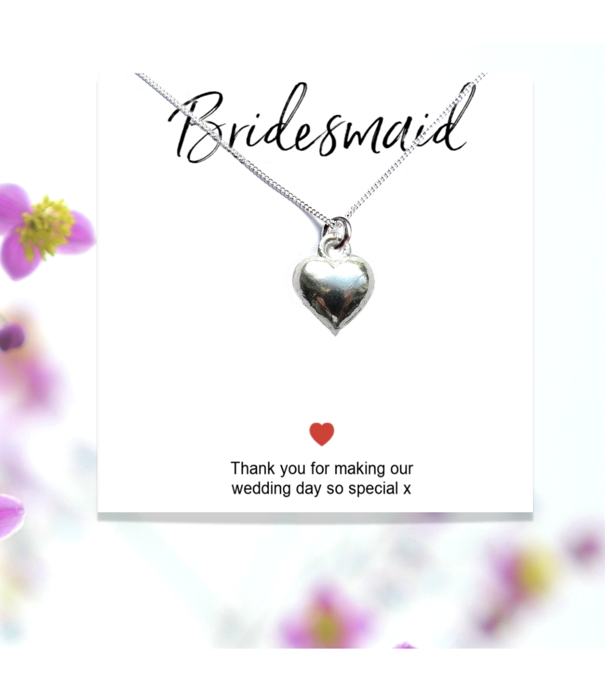 Our Thank You bridesmaid necklace is made for you in our design studio in Scotland. Our bridesmaid necklace has a lovely heart charm and is presented on a gift card with the words "Thank you for making our wedding day so special". A unique gift that can be treasured forever. The card has a small space for you write a little note or can be left blank.