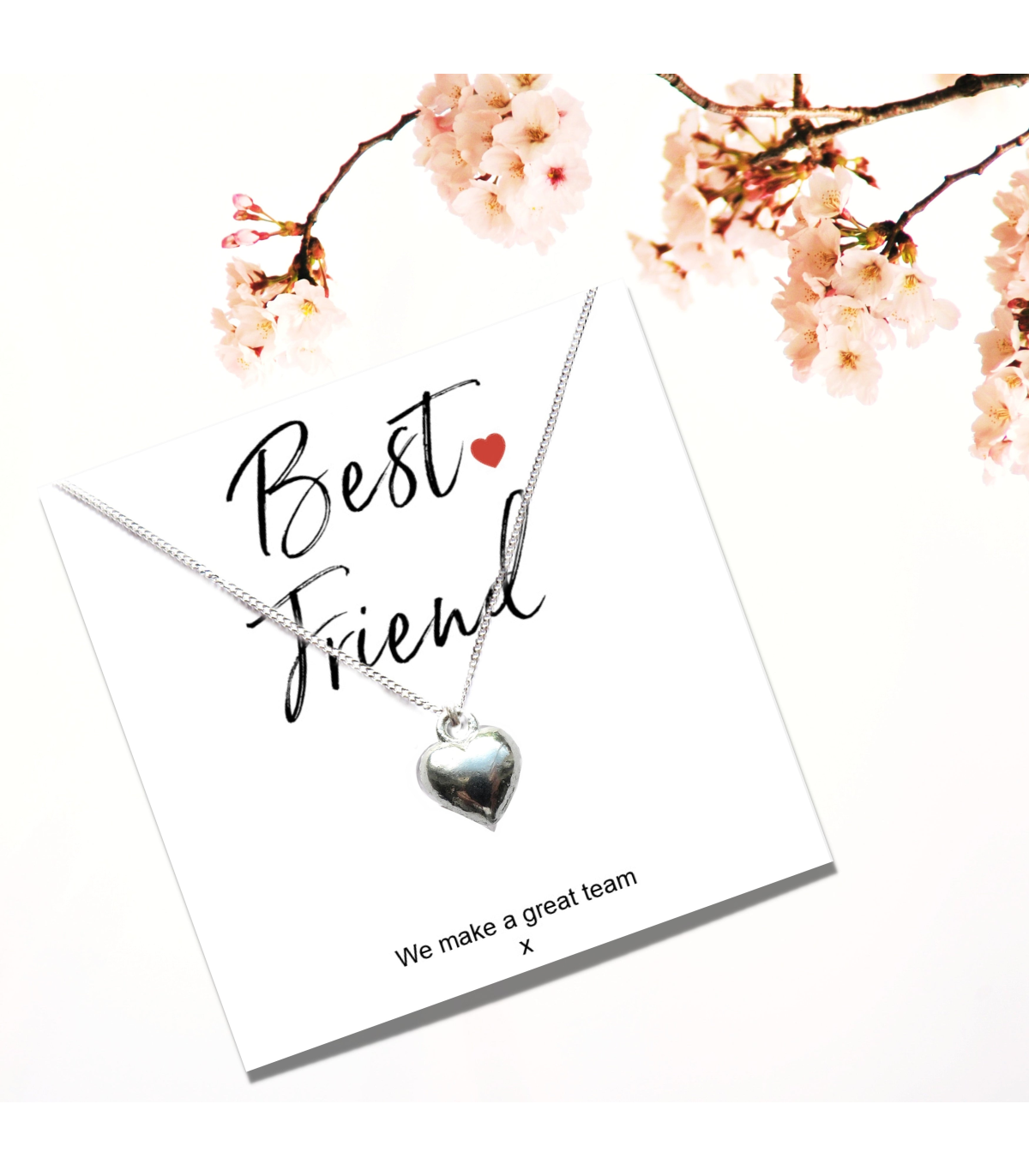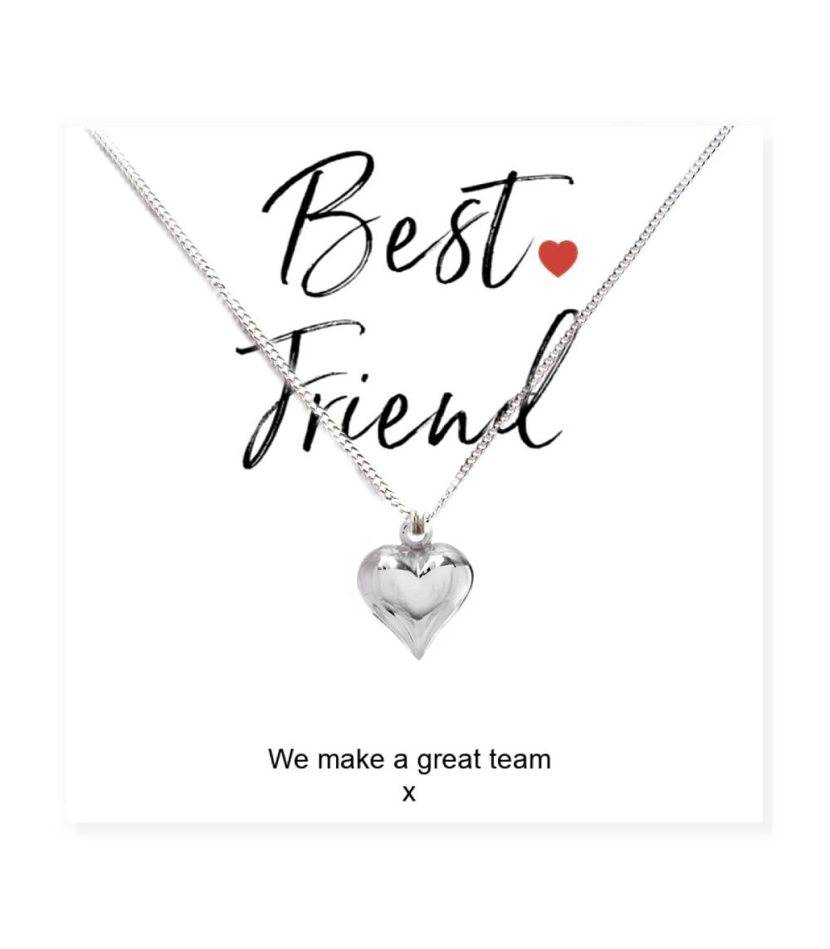 This Best Friend silver heart charm necklace is presented on a gift card with the word "We Make A Great Team" with a small space for you write a little note or it can also be left blank the choice is yours. It's a great keepsake gift to give to a women or girl on her birthday, Christmas or as a thank you gift. A unique gift that can be treasured forever.