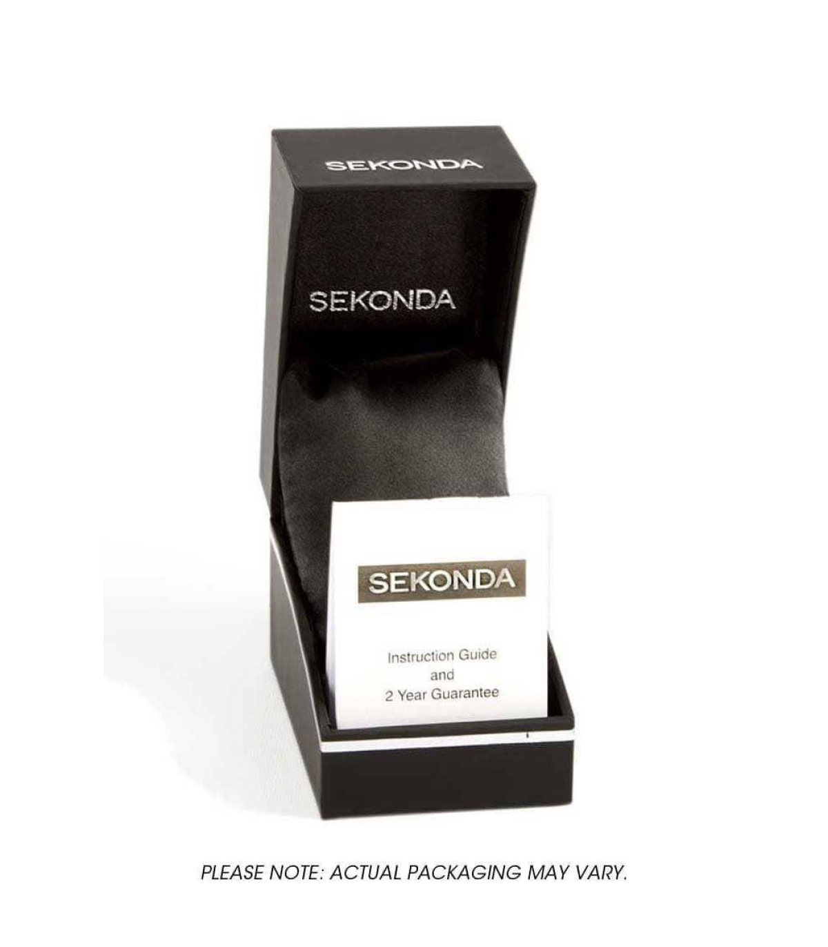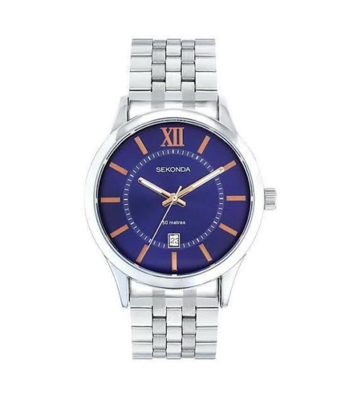 This eye catching Gents Sekonda has a quality feel to it. Its easy to read purple dial with large Rose gold tone roman numeral hour markers and hands are complimented by a date window at 6 o'clock position Round case with purple dial Date Window at 6 o'clock position Stainless steel bracelet with 3 fold clasp (will fit wrist sizes upto 195mm) Water Resistant to 50 Metres Battery quartz movement