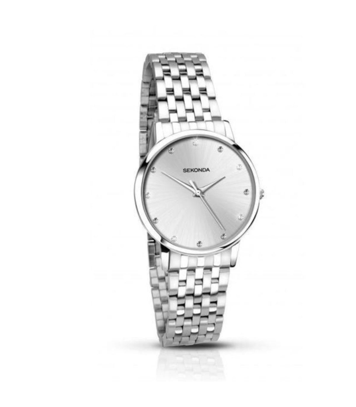 The Sekonda 2444 ladies watch has a round chrome case